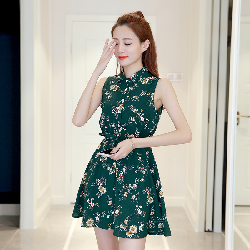 / 夏裝新款女裝復古印花無袖襯衫裙收腰顯瘦碎花雪紡背心連衣裙