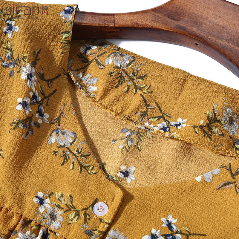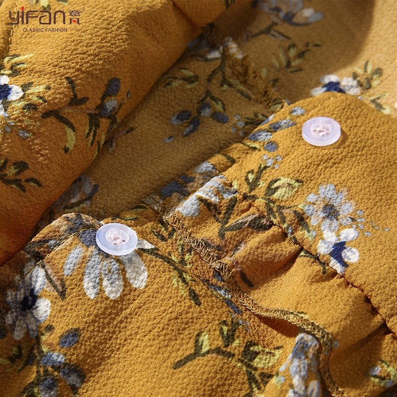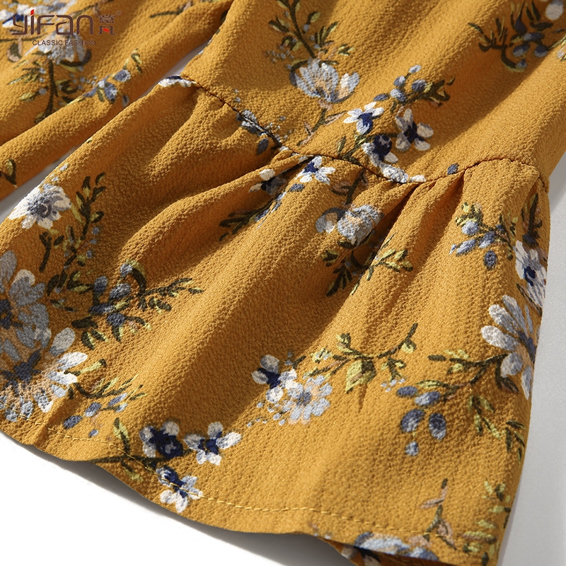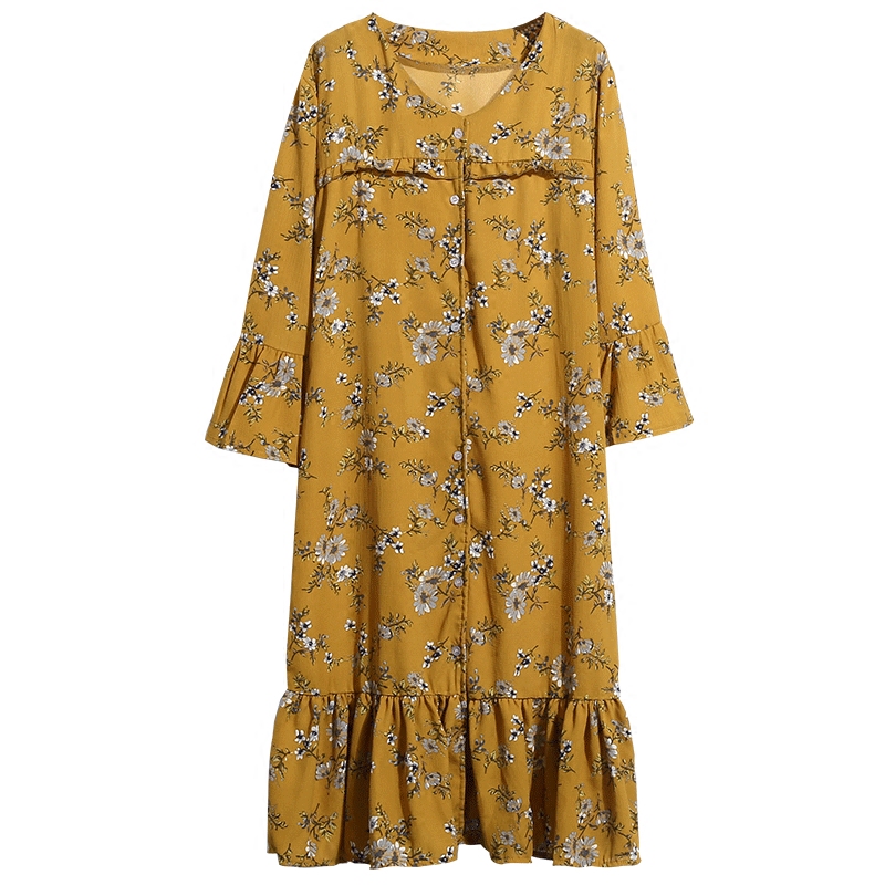 / 夏季寬松長袖拼接荷葉邊連衣裙女裝碎花雪紡百褶中長打底裙新