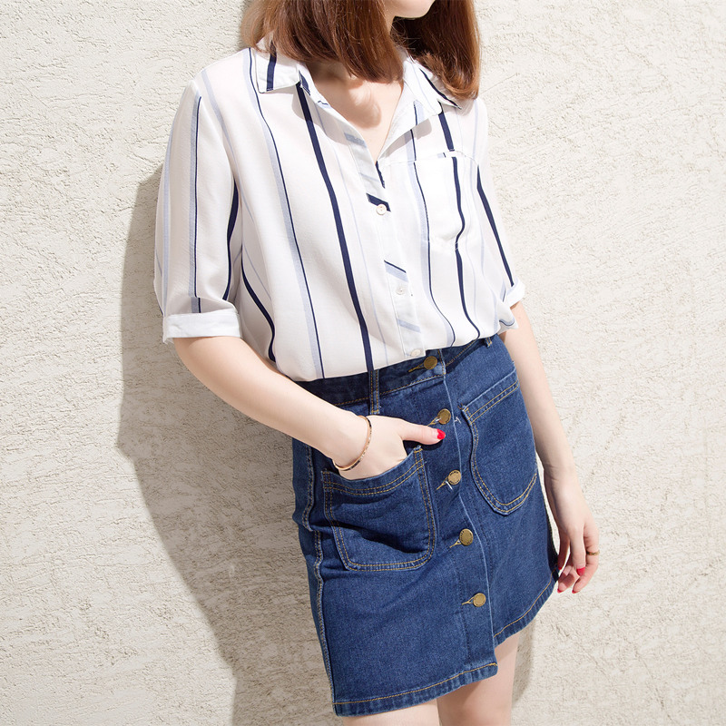 / 條紋白襯衫女甜美上衣小清新港味雪紡襯衣半袖韓范女夏裝新款
