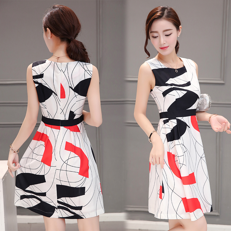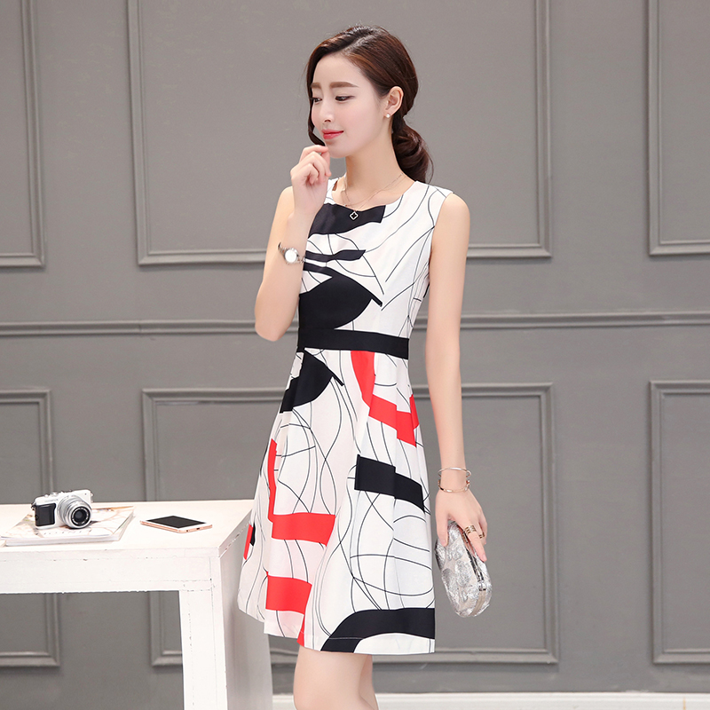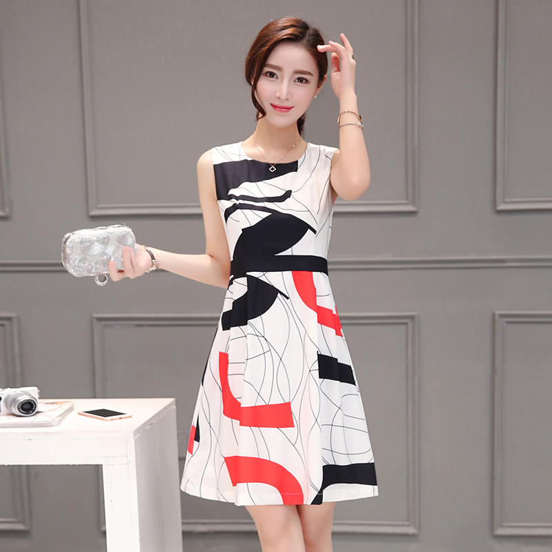 夏季新款時尚印花無袖連衣裙女韓版修身顯瘦名媛中長款A字裙
