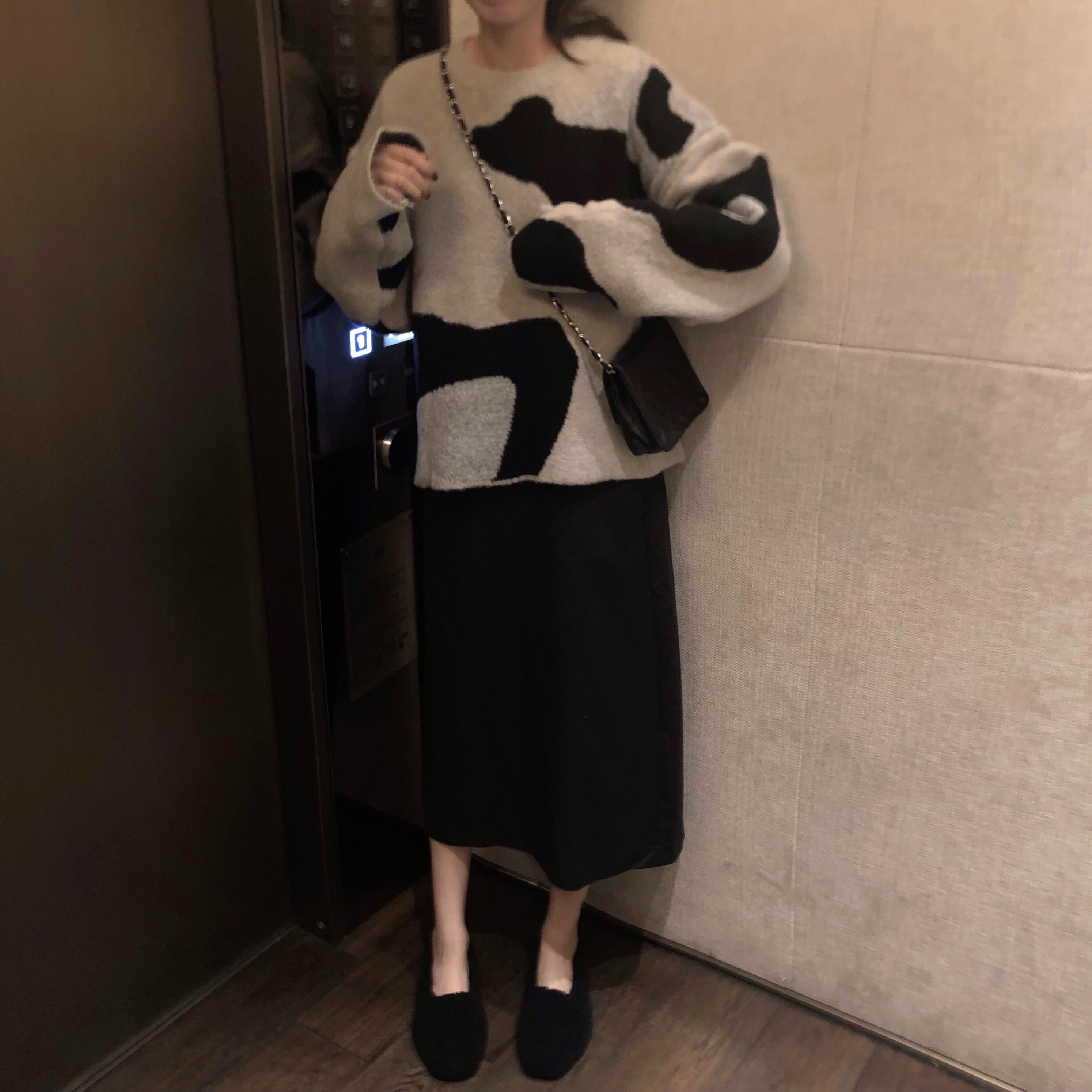 / 冬韓版套頭保暖厚寬松奶牛毛衣上衣時尚套裝純色顯瘦開叉半身裙女