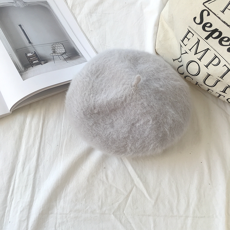 秋冬新款韓版復古chic風蓓蕾帽甜美純色加厚清新針織兔毛貝雷帽女