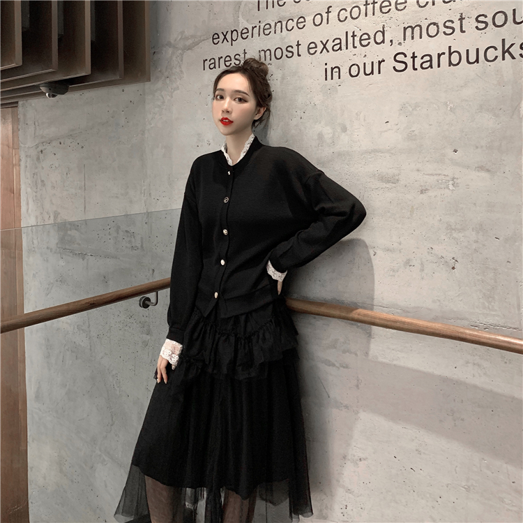 / 2018秋冬新款宮廷風蕾絲拼接復古氣質短上衣網紗半身裙時尚套裝潮
