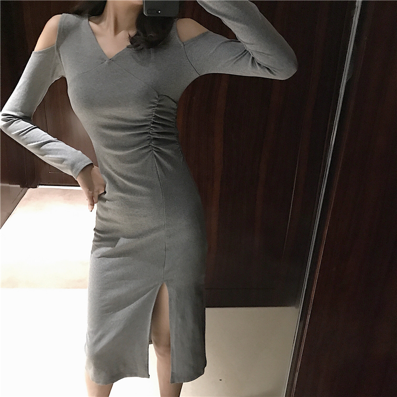 / 晚晚風2018秋裝新款韓版漏肩打褶修身開叉休閑裙中長款打底連衣裙