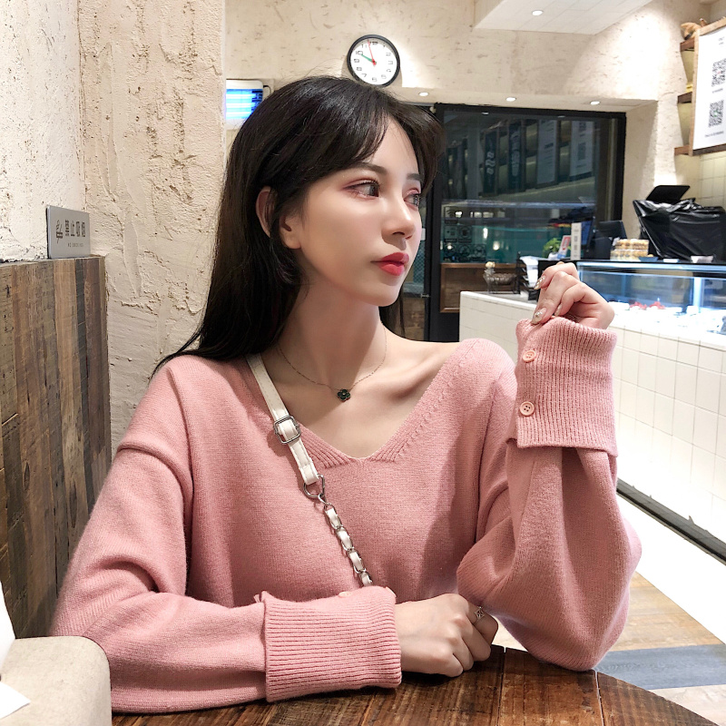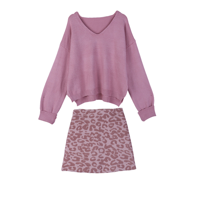 chic新款韓版V領卷袖針織衫寬松側開叉毛衣呢子A字豹紋裙時尚套裝