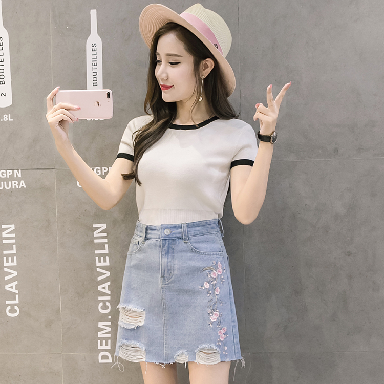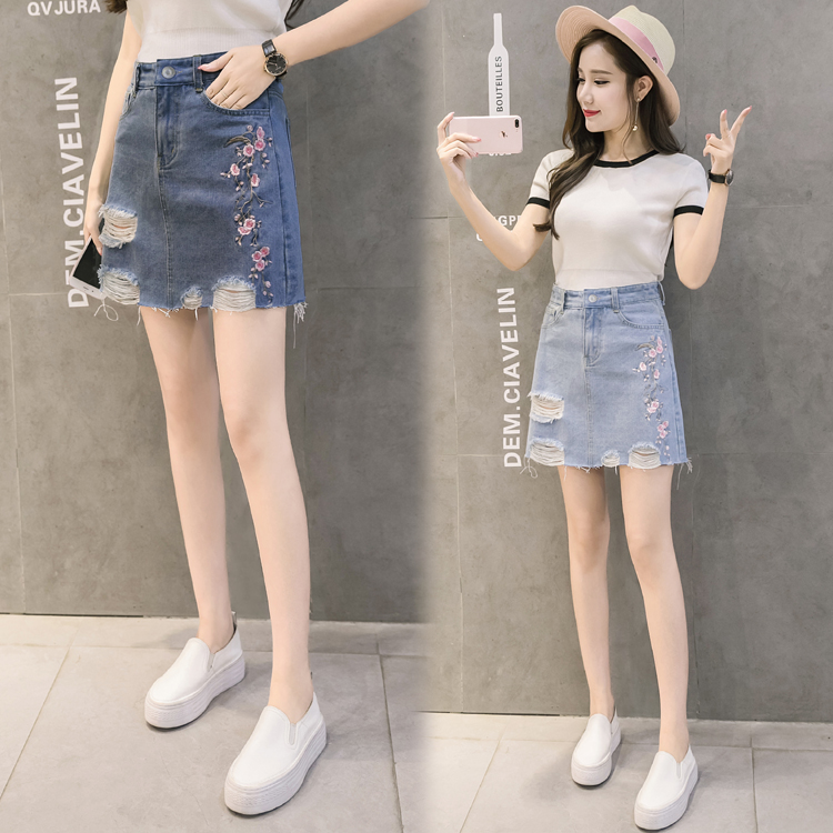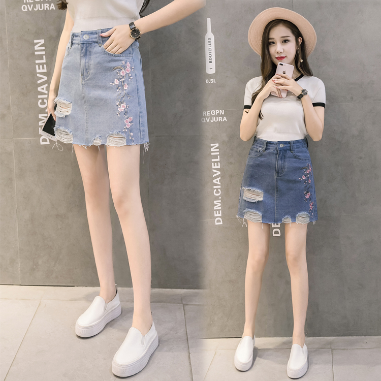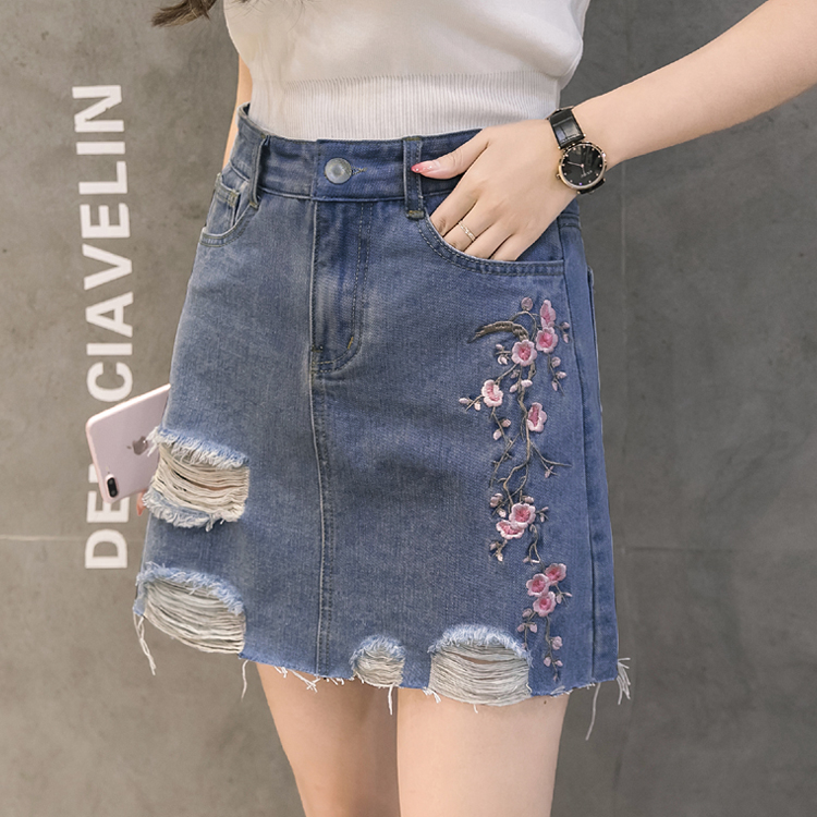 / 夏季韓版高腰繡花牛仔裙半身裙女破洞A字裙包臀短裙磨破刺繡半裙