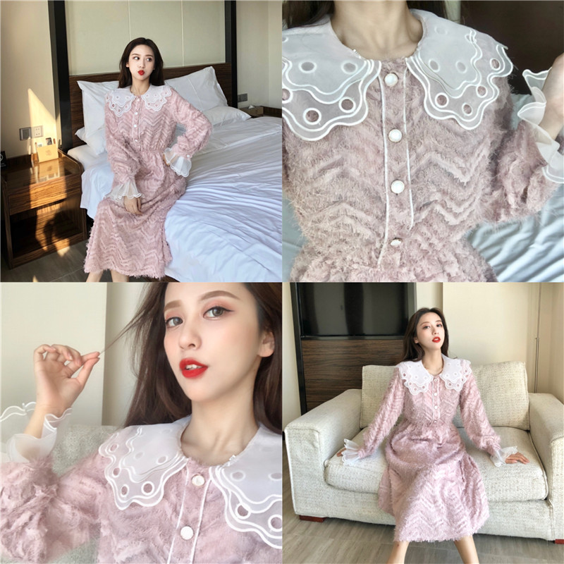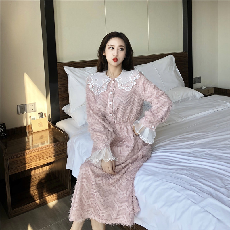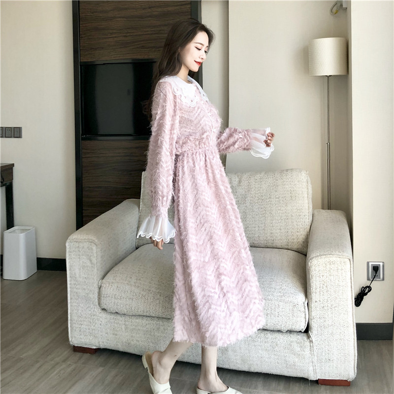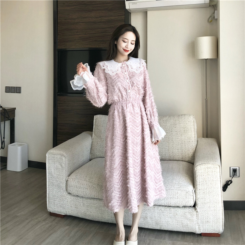 2018冬季新款晚晚風時尚拼接透明網紗長袖高腰百搭A字裙連衣裙女