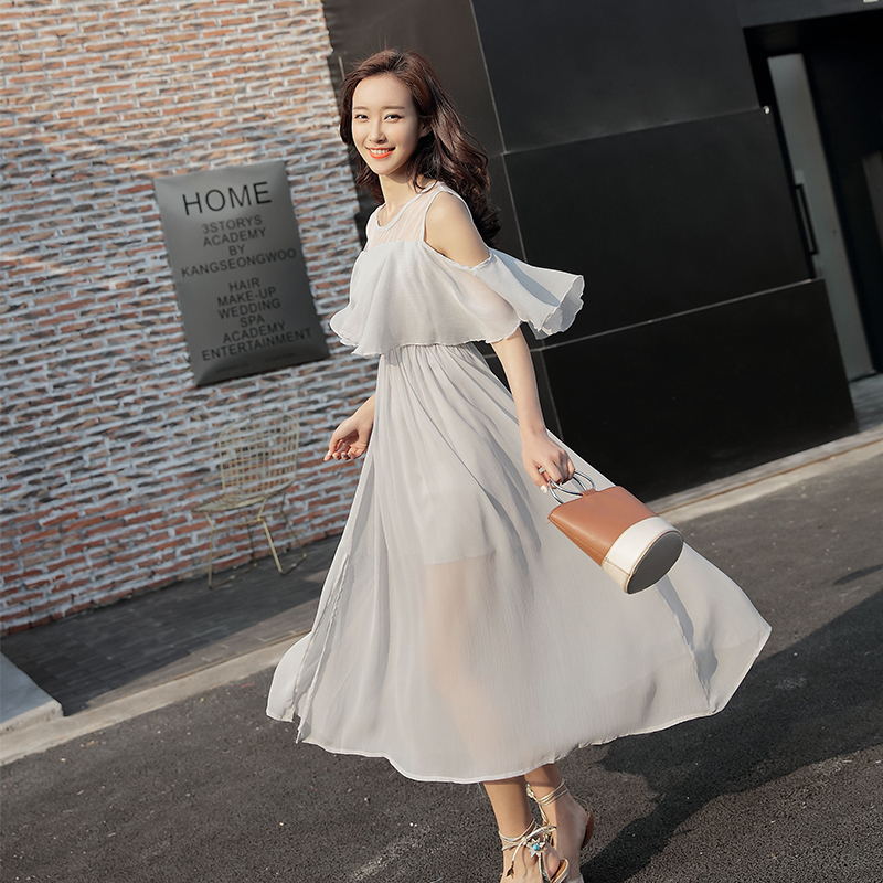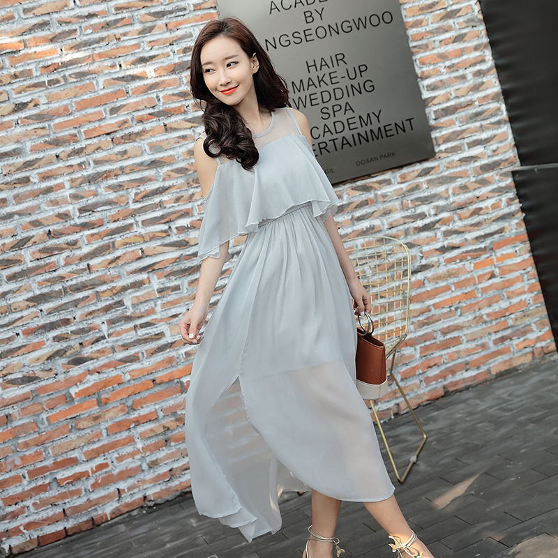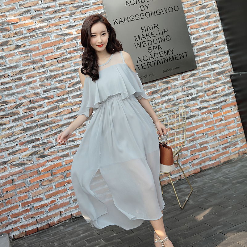 / 夏季新款開叉雪紡仙氣長裙顯瘦網紗拼接露肩連衣裙海邊度假沙灘裙