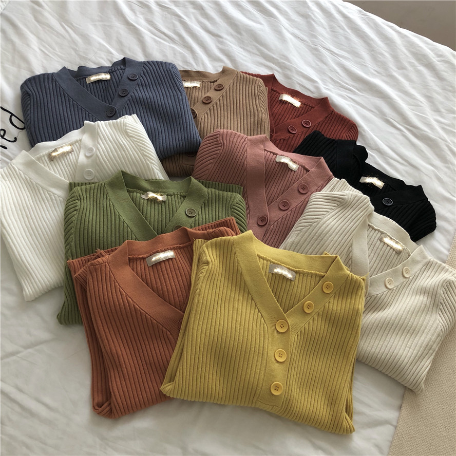 / 上衣新款韓版百搭復古V領一排扣針織衫毛衣長袖修身套頭打底衫潮