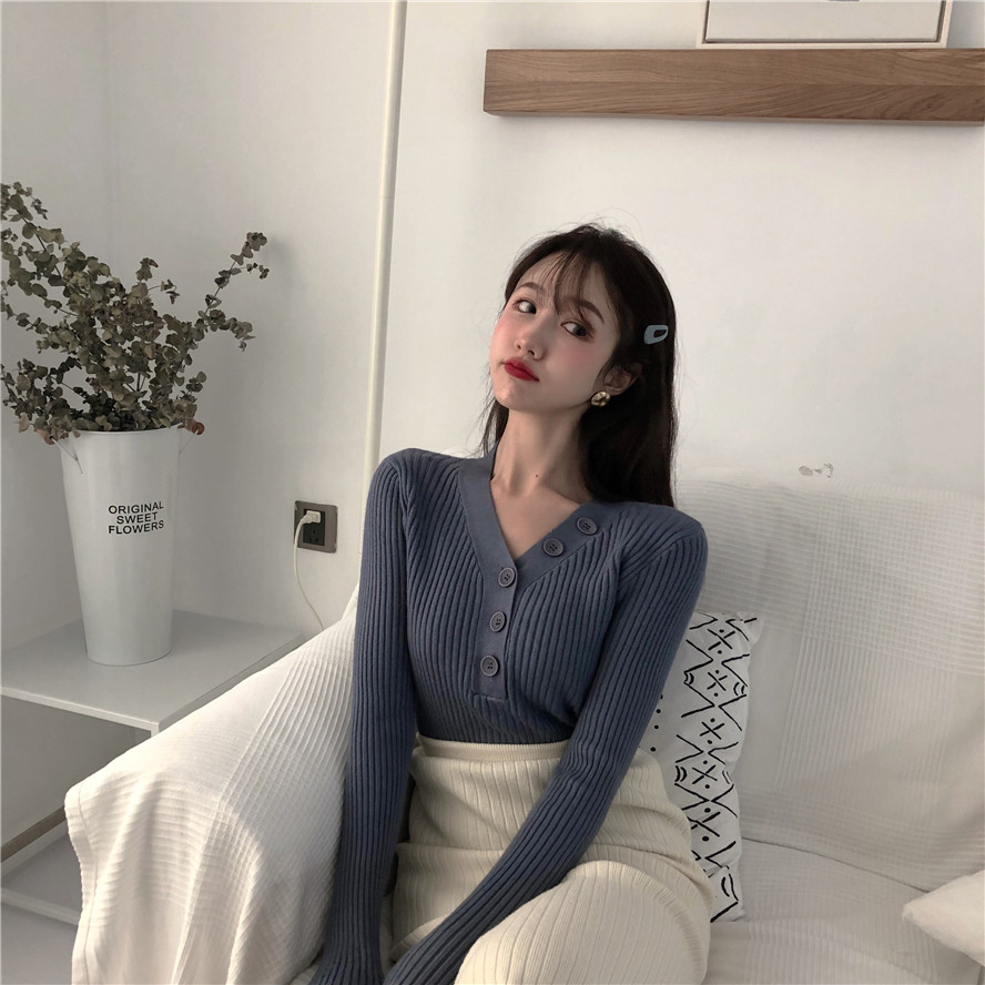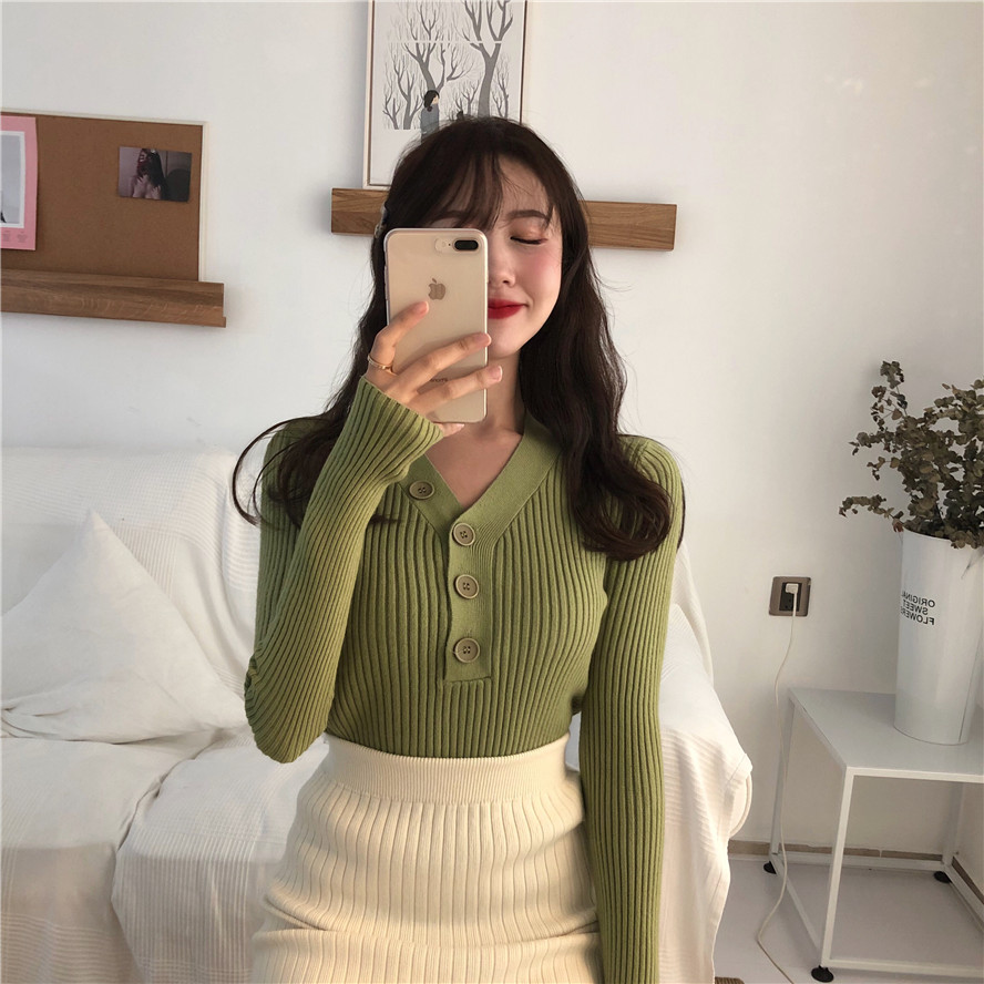 上衣新款韓版百搭復古V領一排扣針織衫毛衣長袖修身套頭打底衫潮