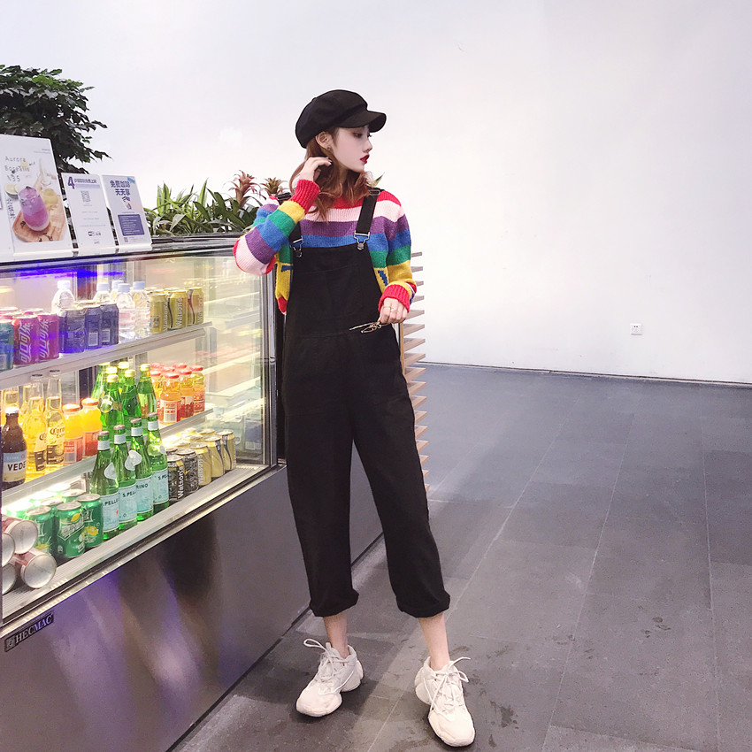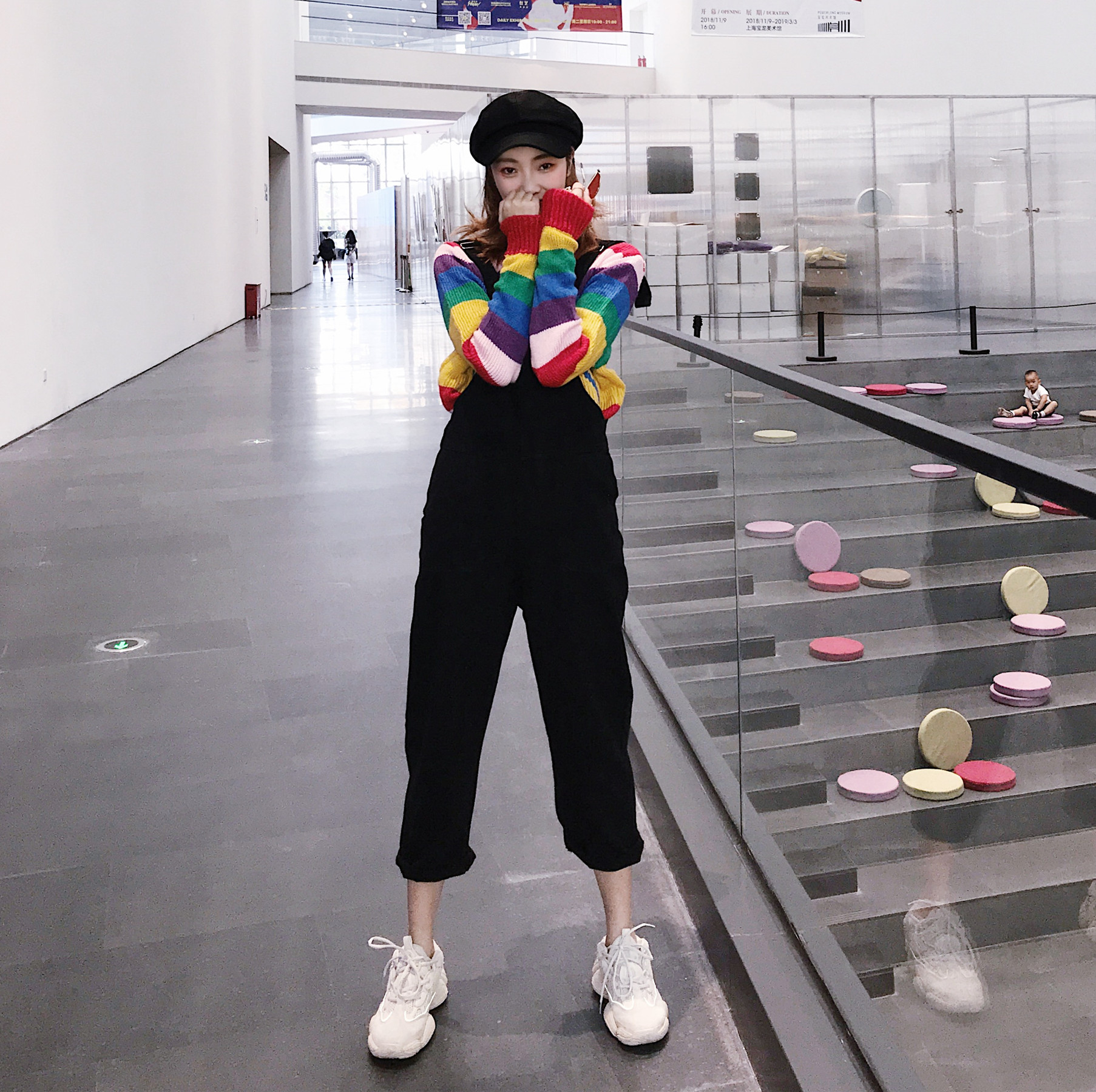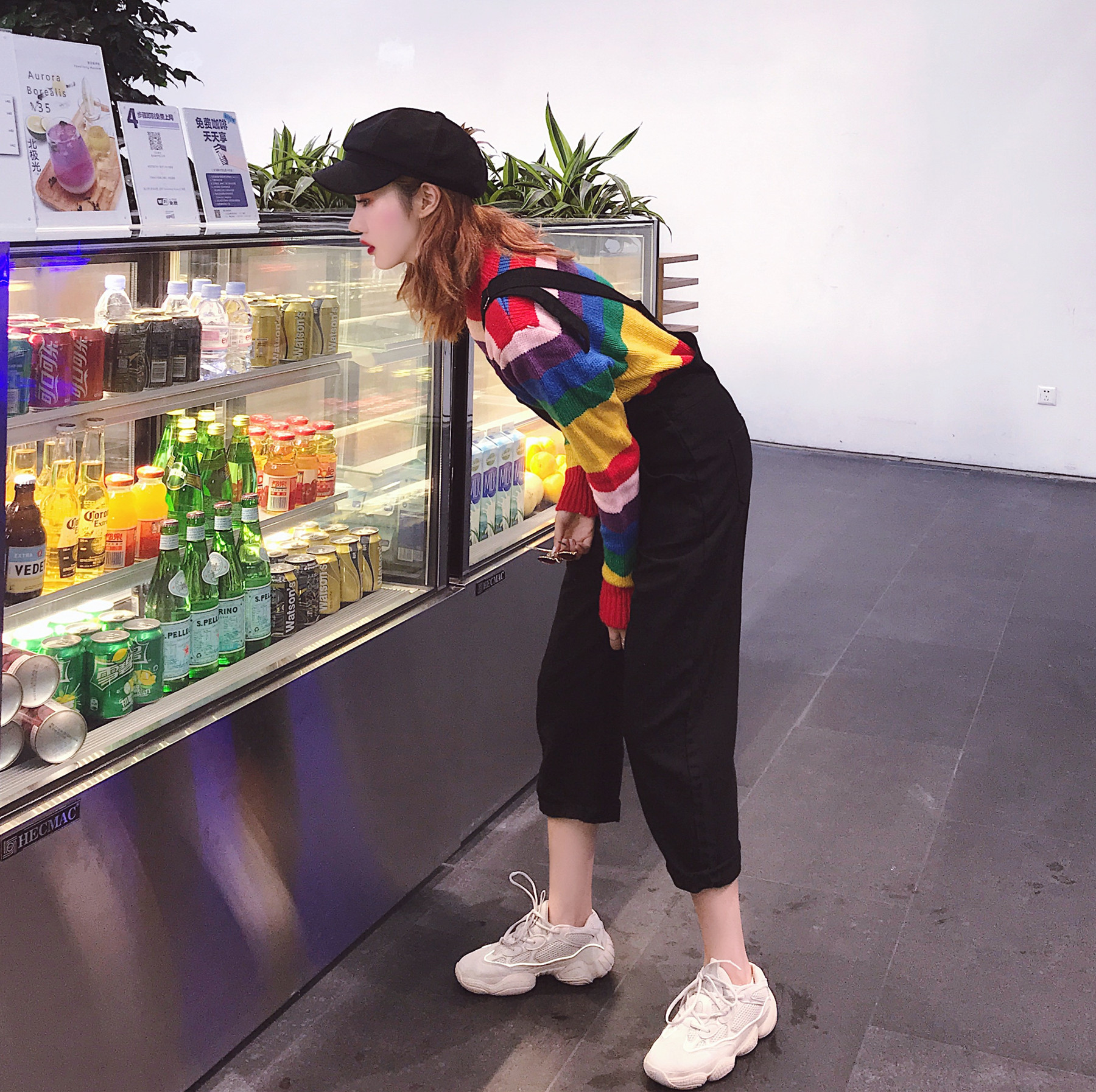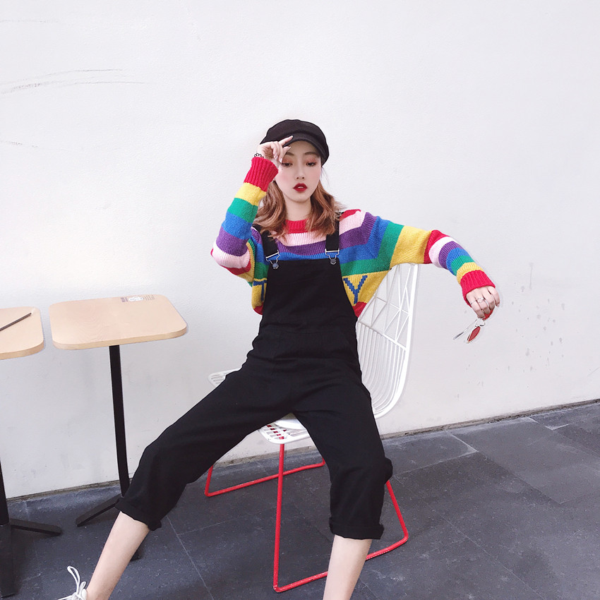 / 秋冬新款復古氣質百搭彩虹條紋毛衣牛仔背帶褲兩件套港風時尚套裝