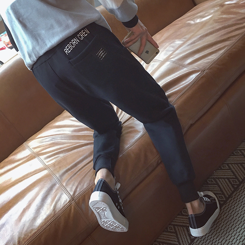 男裝港風新款皮貼標哈倫褲束腳衛褲男士加絨運動褲