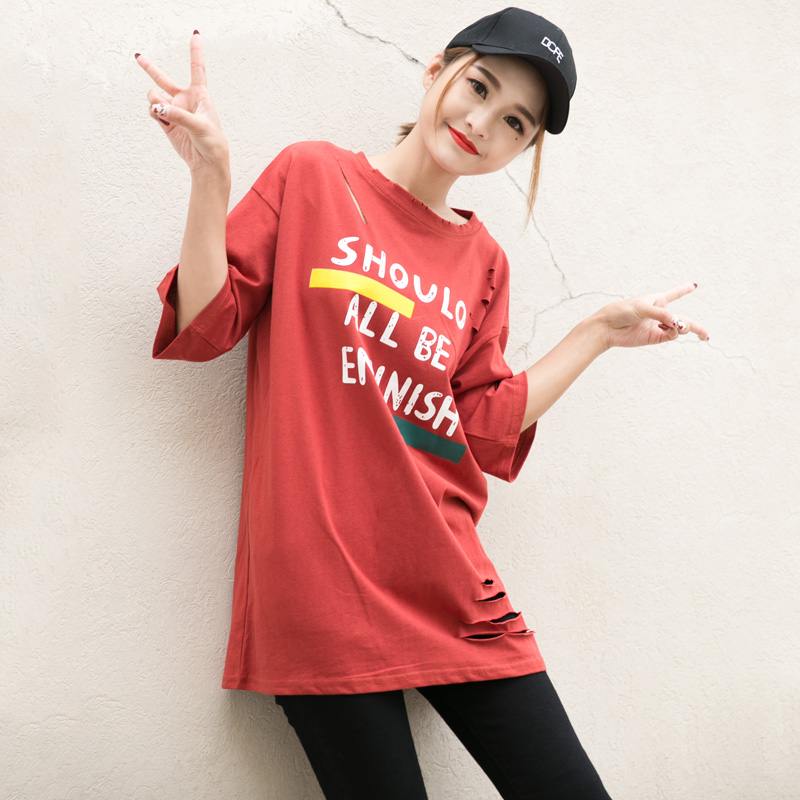 / 韓范新款女裝寬松大碼中長款半袖上衣破洞字母圓領短袖T恤衫