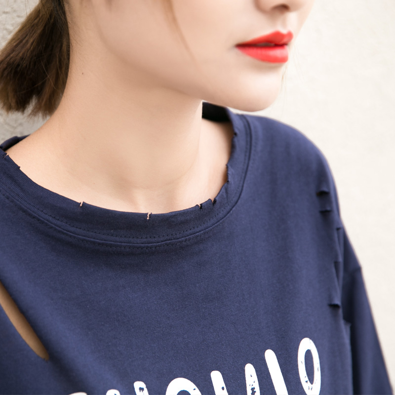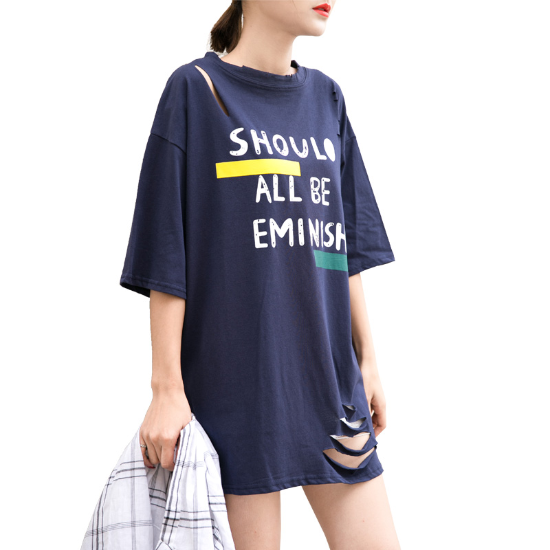 韓范新款女裝寬松大碼中長款半袖上衣破洞字母圓領短袖T恤衫