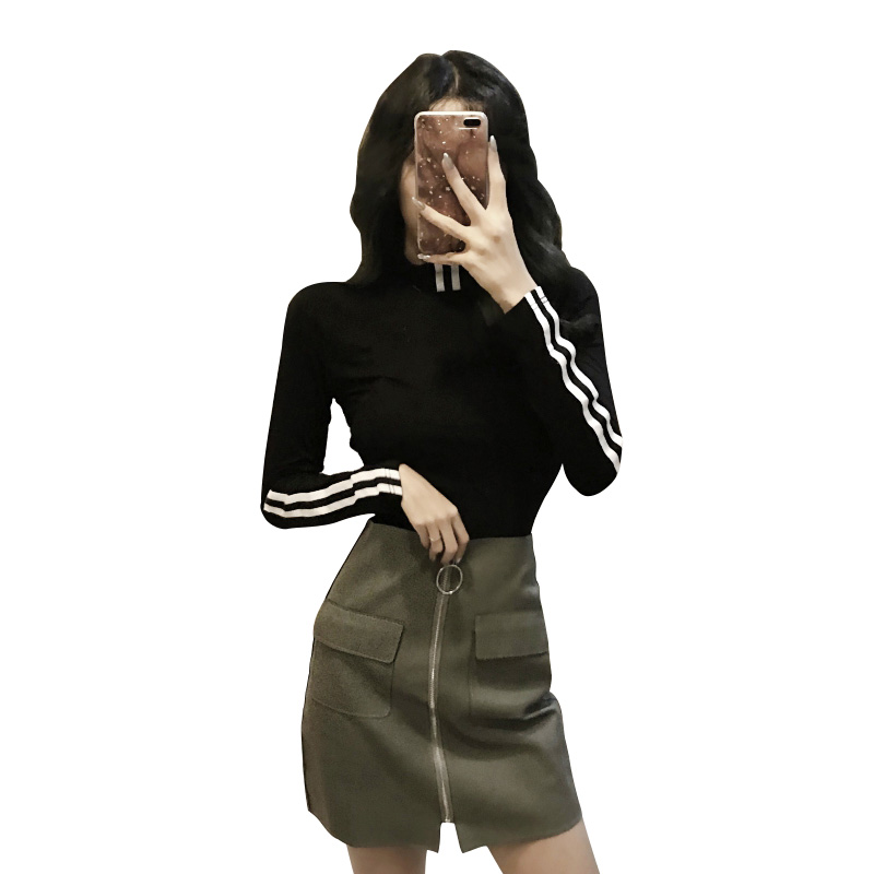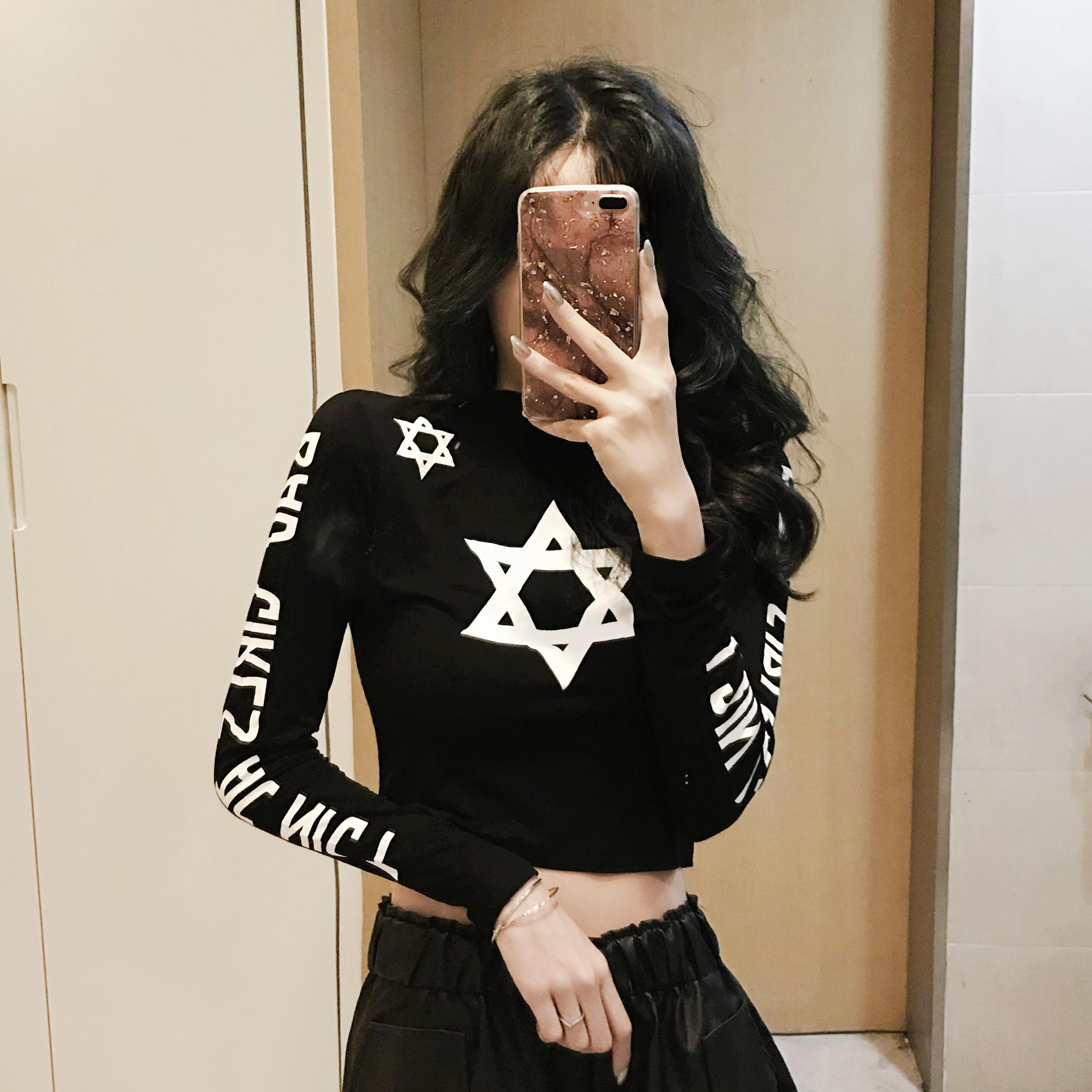 chic風2018秋季新款顯瘦半高領時尚印花上衣百搭長袖T恤打底衫女