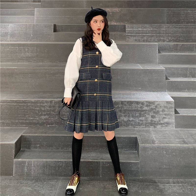 / 復古v領無袖格子連衣裙時尚套裝港味網紗喇叭袖襯衫上衣兩件套女