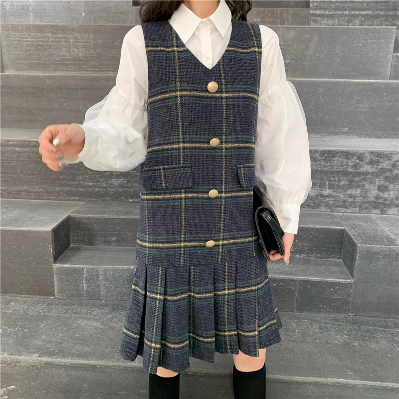 復古v領無袖格子連衣裙時尚套裝港味網紗喇叭袖襯衫上衣兩件套女