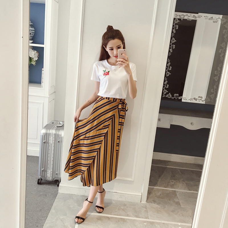 / 夏季新款女裝白色刺繡玫瑰短袖T恤+復古碎花雪紡半身長裙套裝