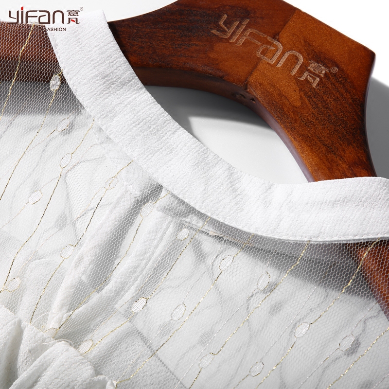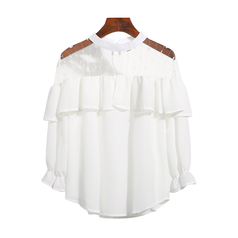 / 春夏新款甜美性感鏤空網紗拼接荷葉邊七分袖雪紡衫喇叭袖純色