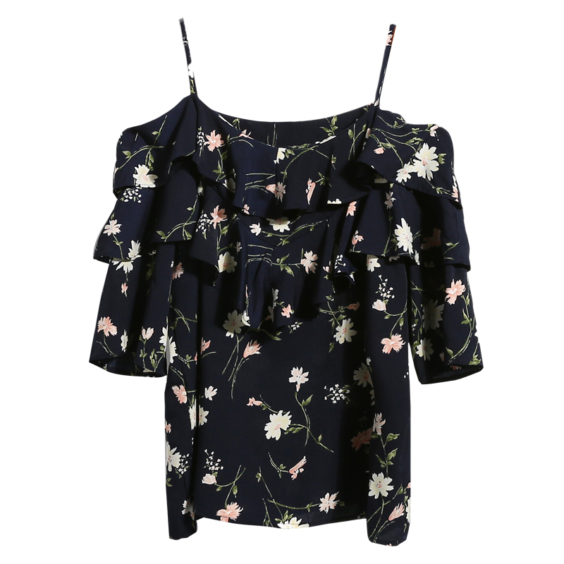 雪紡衫短袖夏季新款甜美荷葉邊吊帶一字肩露肩顯瘦碎花上衣女
