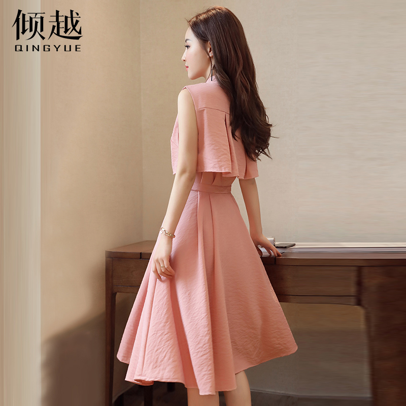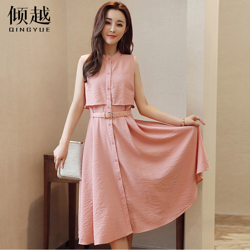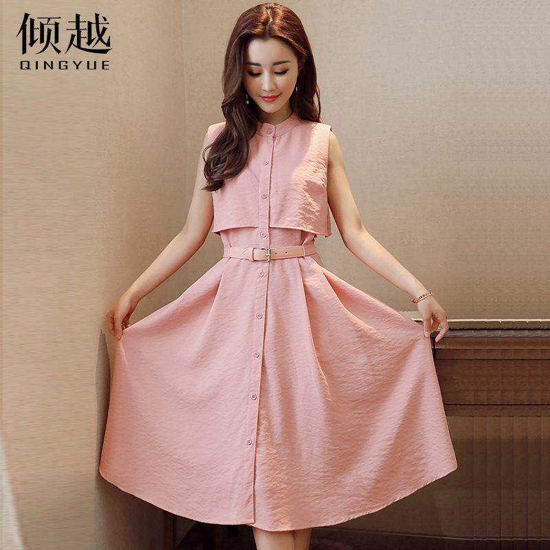 傾越2017夏季新款女裝假兩件襯衫裙中長款無袖連衣裙學院風A字裙