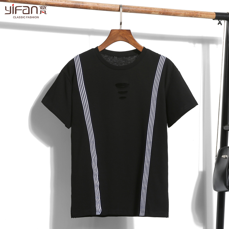 夏季韓版寬松純色短袖T恤新款拼接條紋套頭百搭大碼女裝體恤