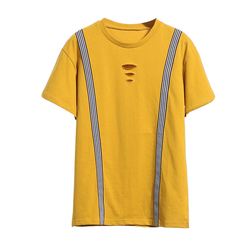/ 夏季韓版寬松純色短袖T恤新款拼接條紋套頭百搭大碼女裝體恤