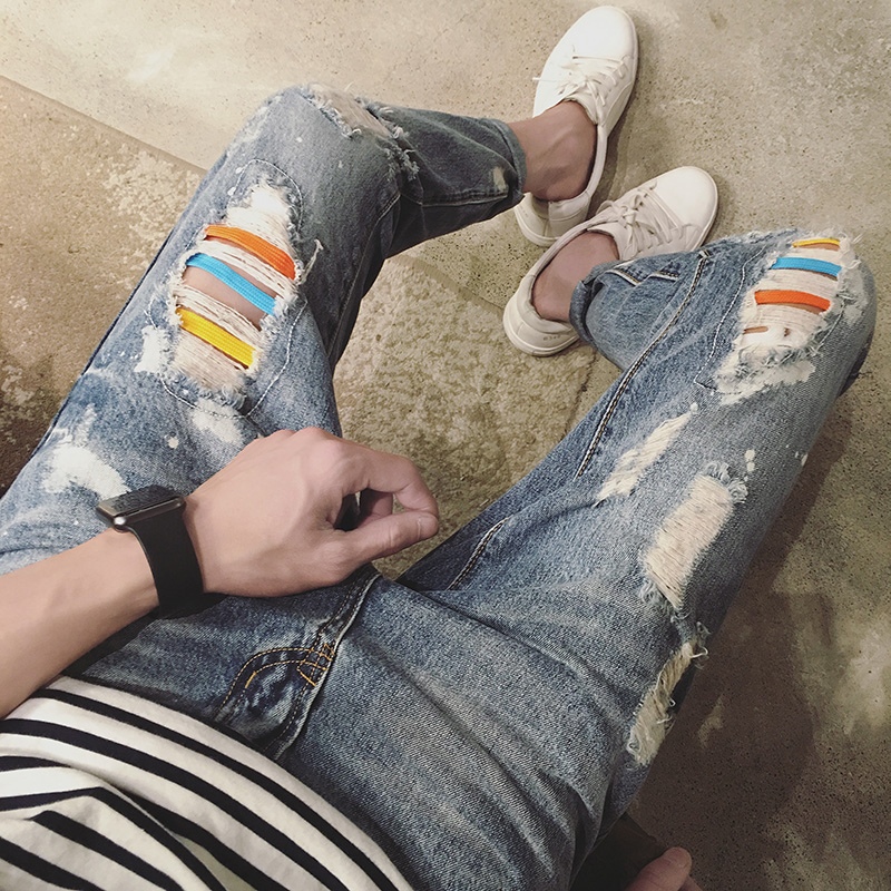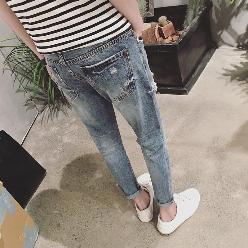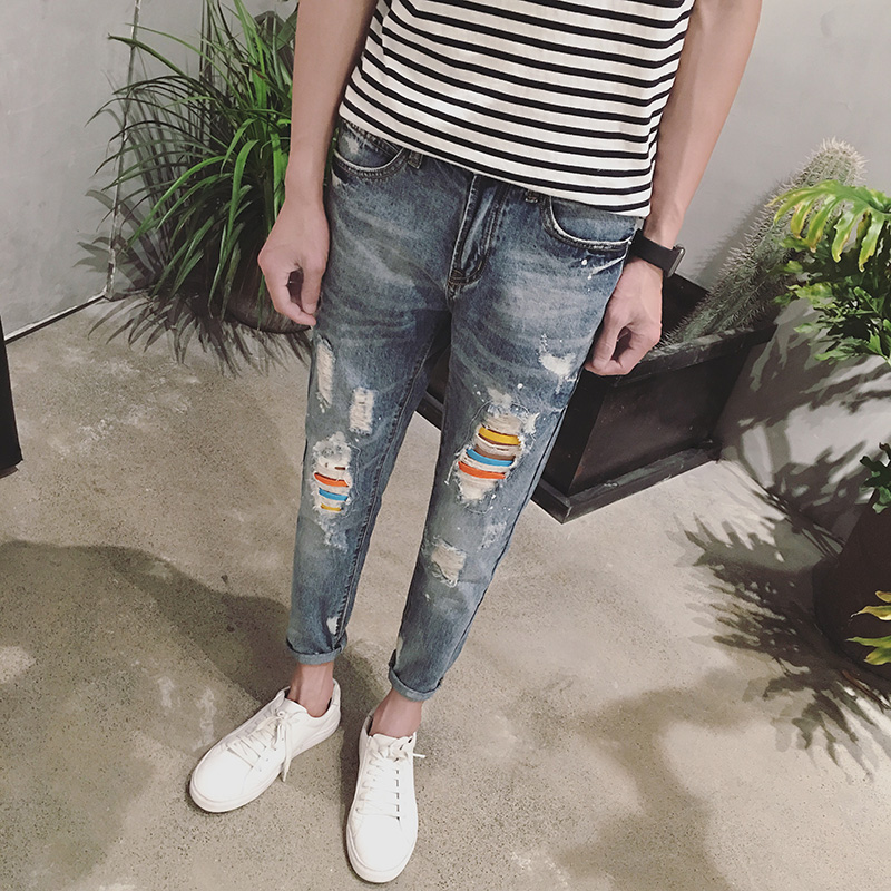 / 新品破洞牛仔褲男小腳薄款修身男士顯瘦九分褲