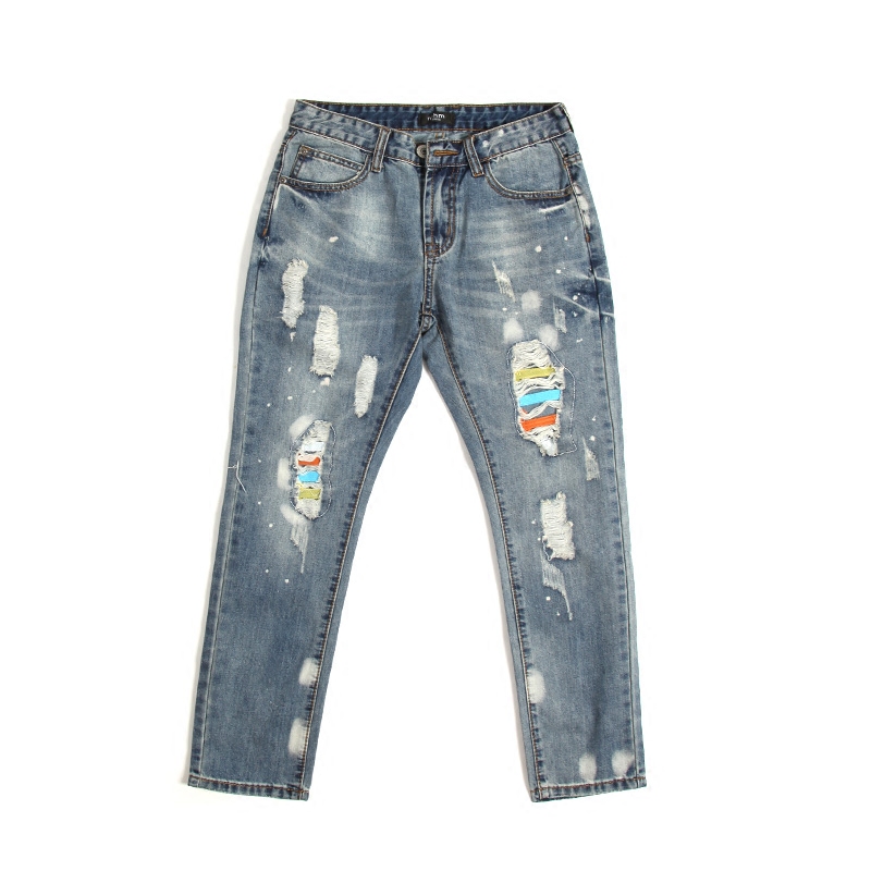 新品破洞牛仔褲男小腳薄款修身男士顯瘦九分褲