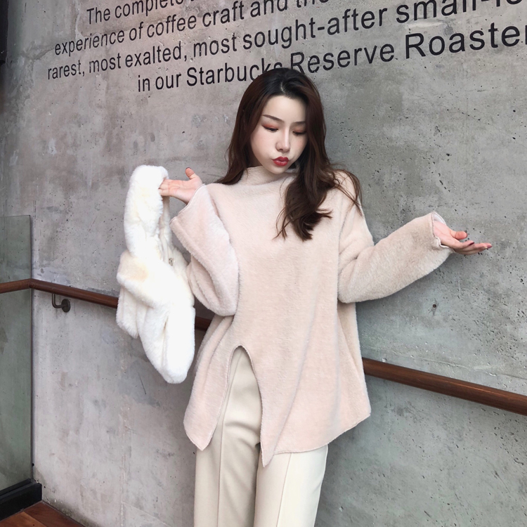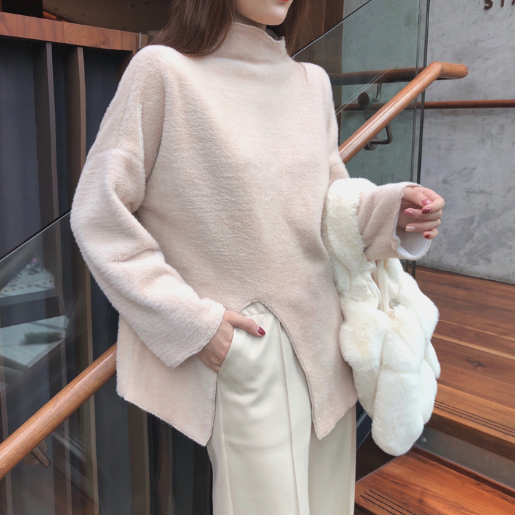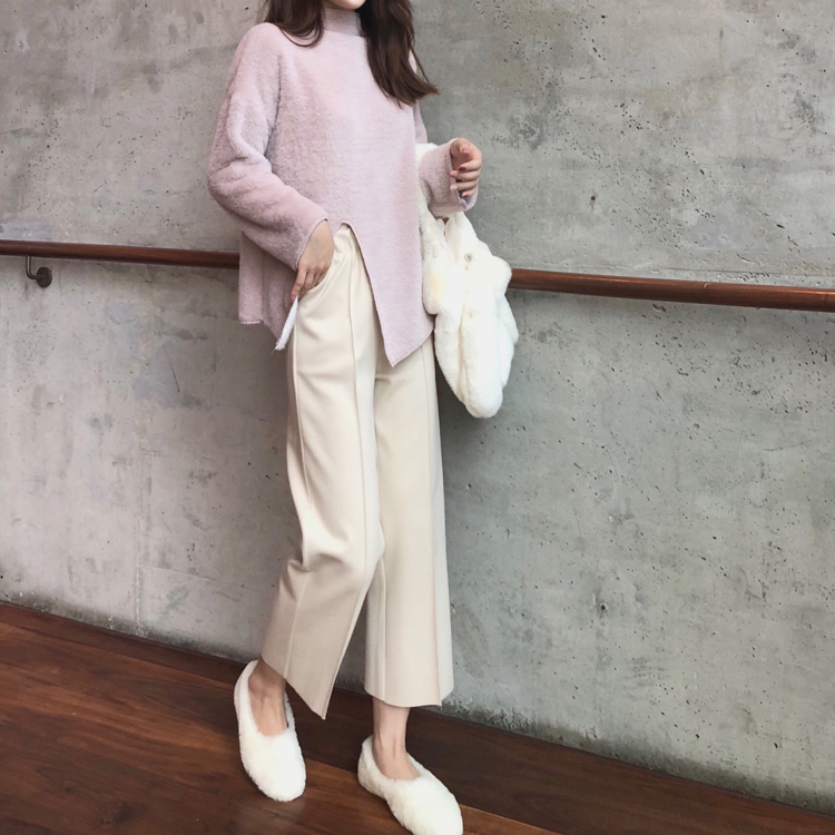 / 秋冬高領保暖顯瘦開叉長袖上衣時尚套裝毛呢闊腿長褲休閑兩件套潮