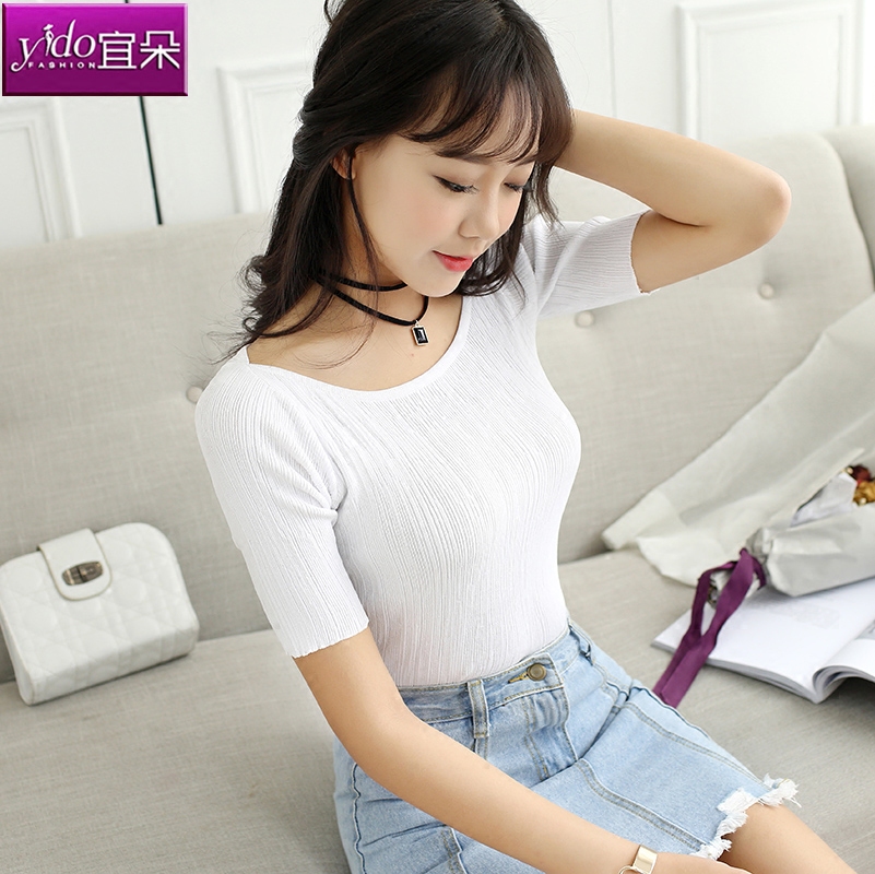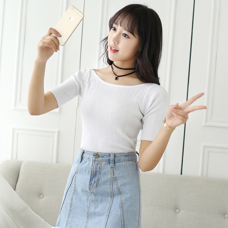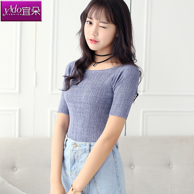針織t恤女短袖圓領修身春夏季薄款針織衫上衣女夏短款套頭打底衫