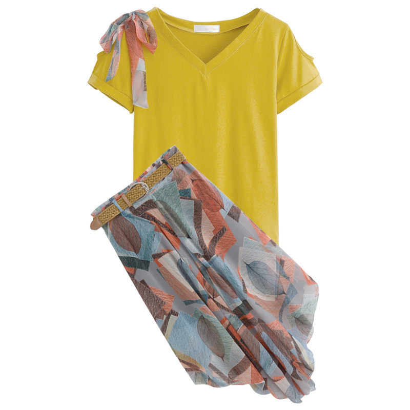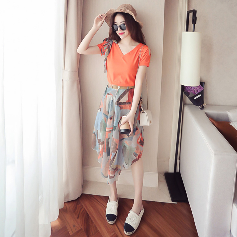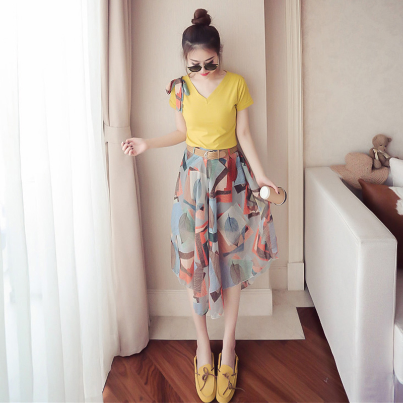 夏季新款女裝韓版學生兩件套連衣裙女短袖上衣半身裙雪紡套裝
