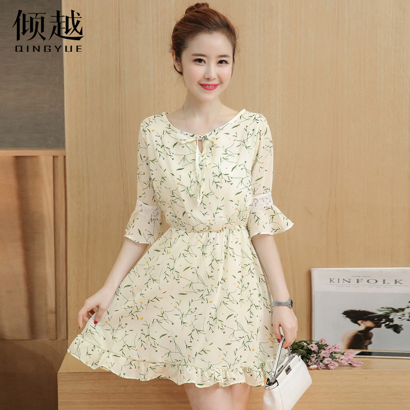 / 傾越2017春夏新款韓版女裝雪紡連衣裙顯瘦中長款魚尾裙子碎花長裙