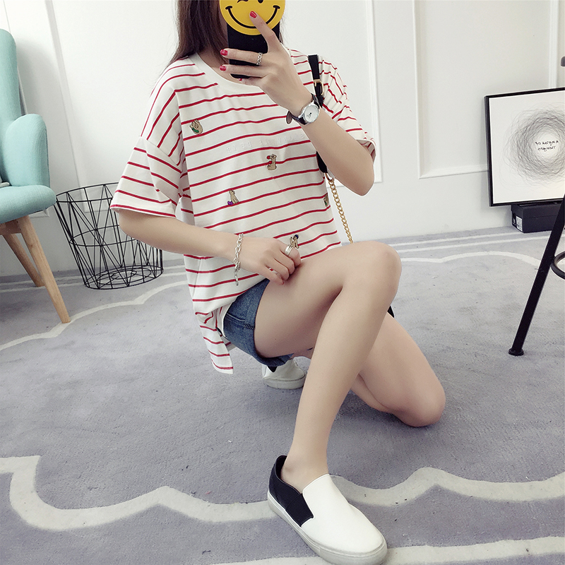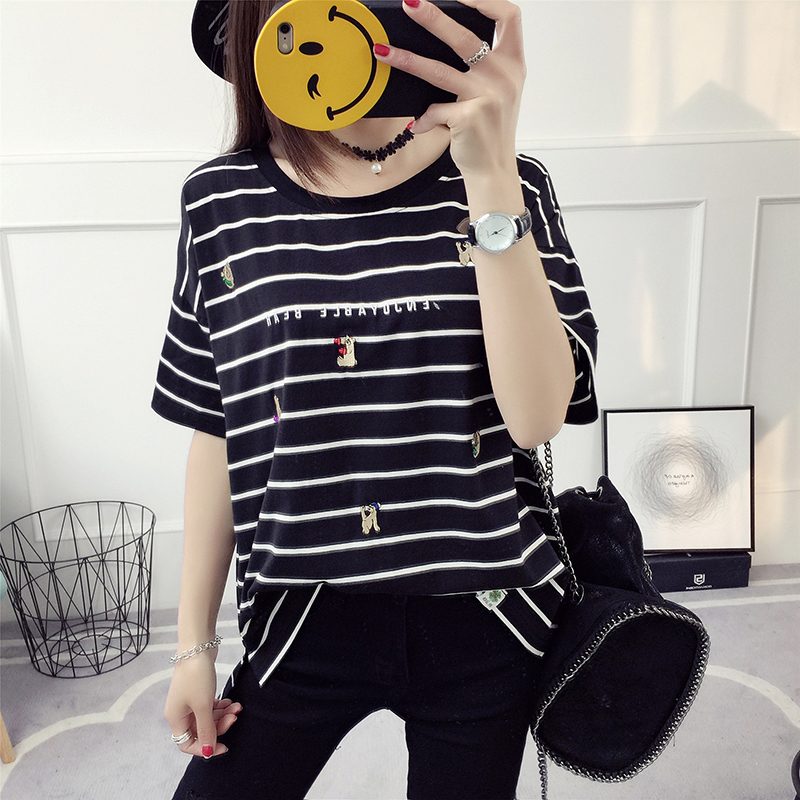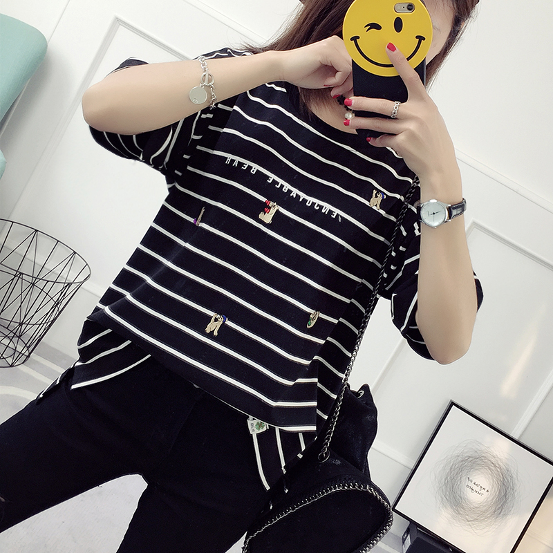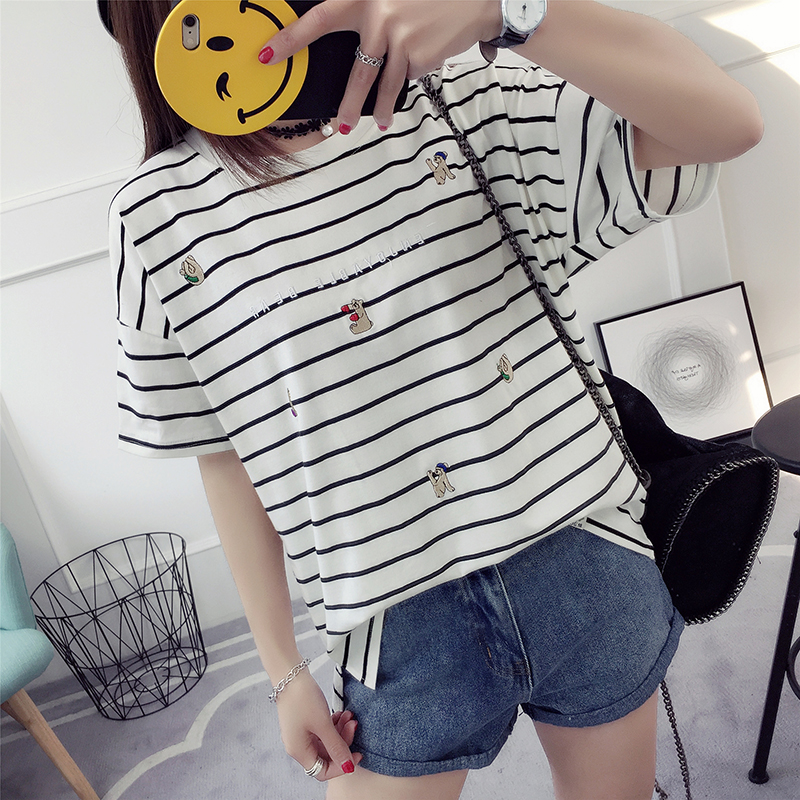 / 黑白條紋t恤女春裝新款潮韓版寬松短袖刺繡打底百搭學生體恤