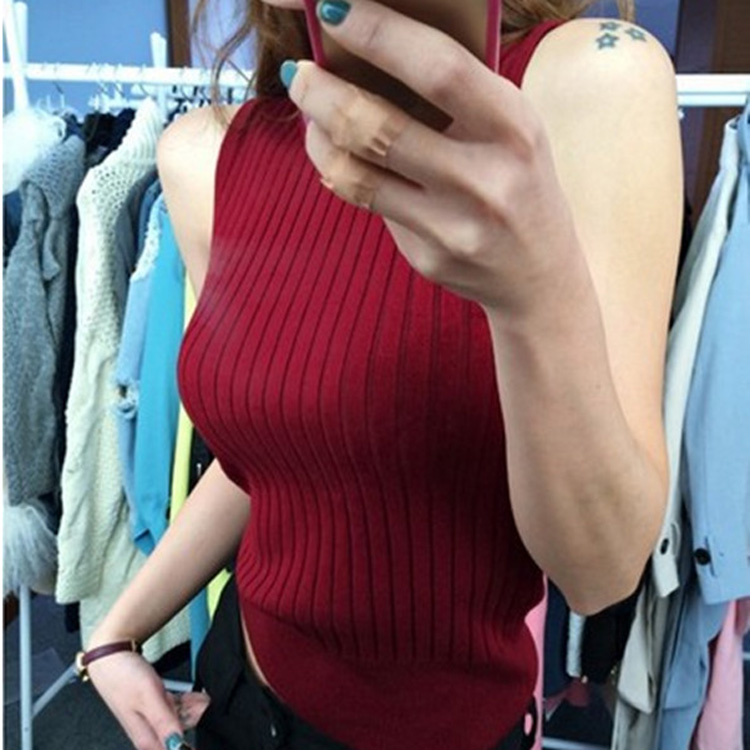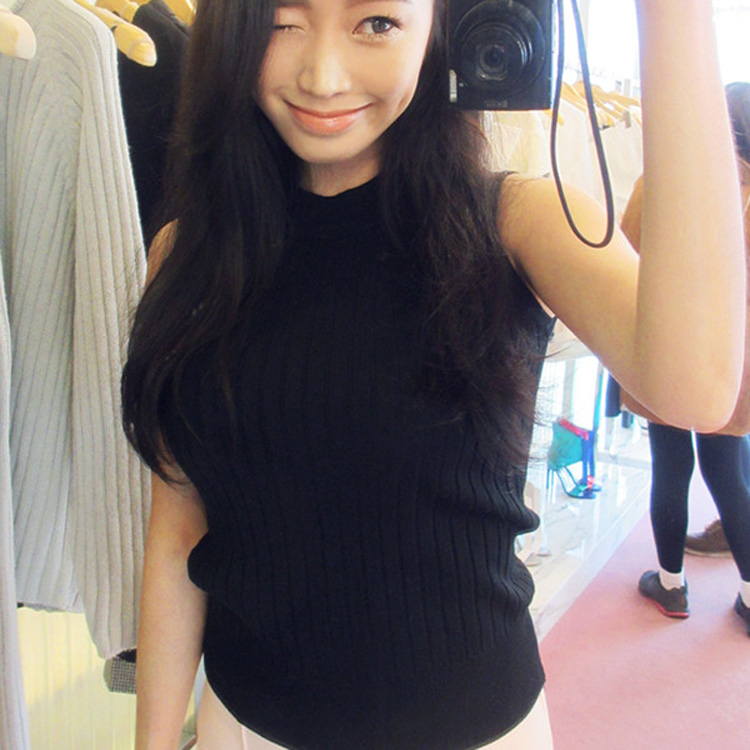 / 春裝新款韓版半高領條紋純色百搭無袖針織衫打底衫上衣背心女