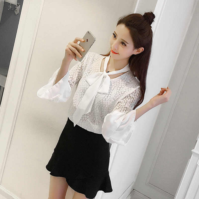 / 雪紡上衣女春季新款韓版拼接喇叭袖顯瘦百搭V領蕾絲衫打底衫