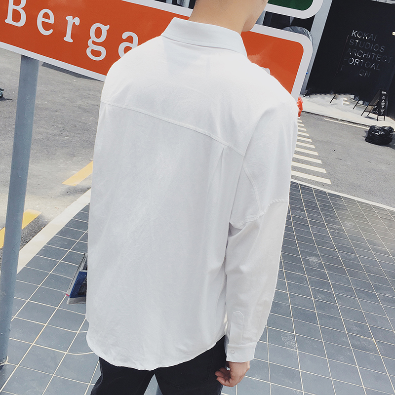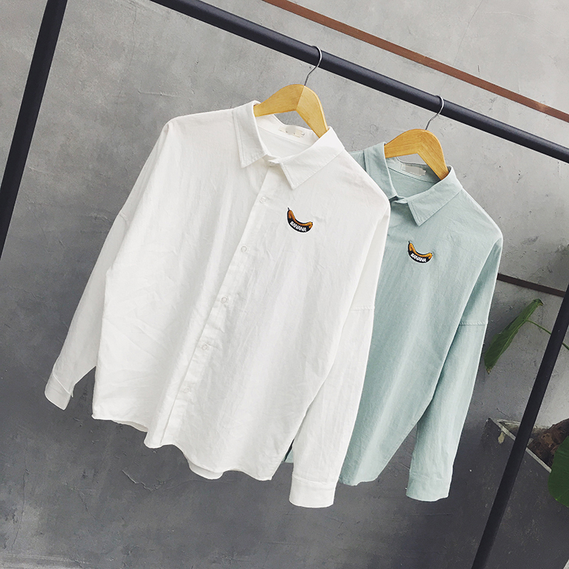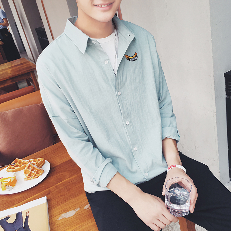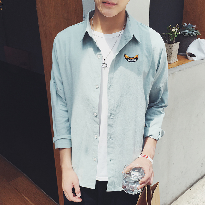 / 秋裝新款韓版香蕉刺繡襯衣男士清新白色長袖襯衫