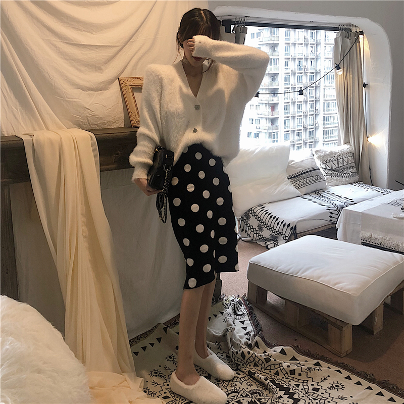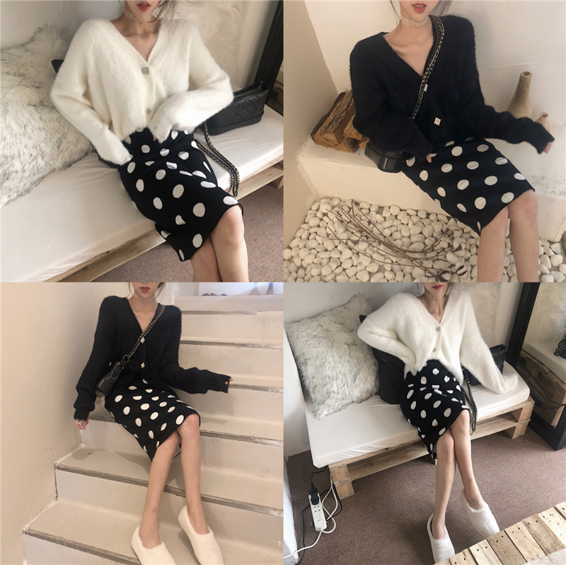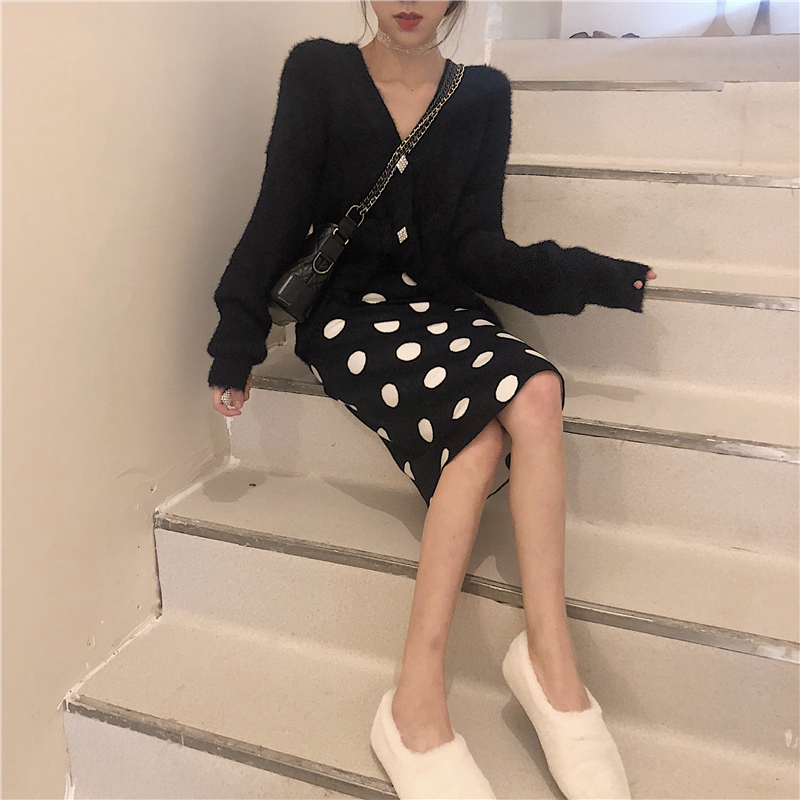 / 時尚套裝慵懶風網紅新款針織開衫高腰針織包臀波點半身裙兩件套女