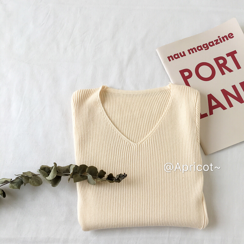 / 秋冬新款V領針織長袖修身緊身保暖打底衫上衣復古套頭顯瘦毛衣女