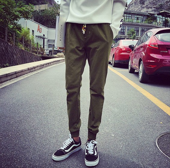 原創設計韓版修身小直筒男士休閑褲系繩束腳褲
