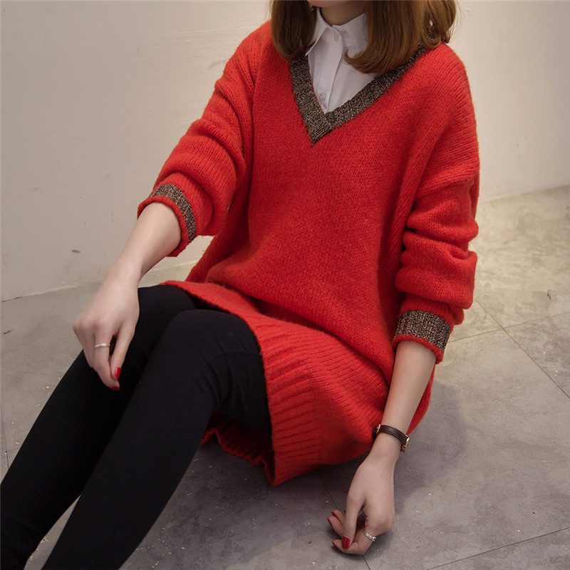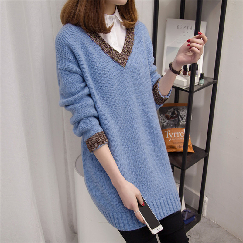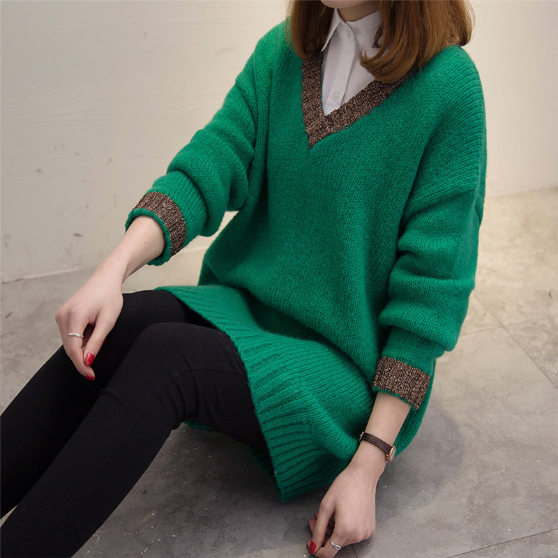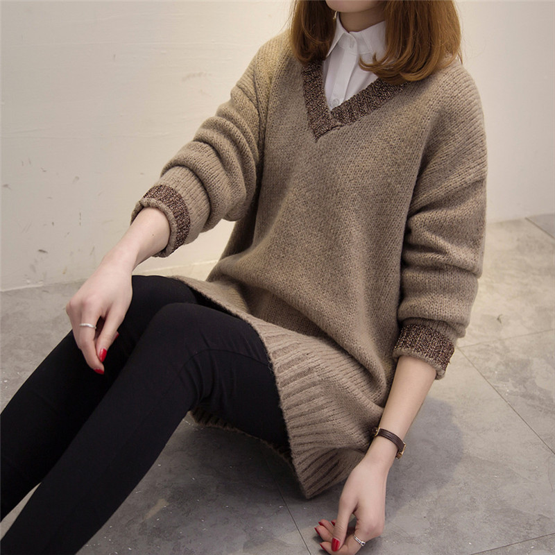 V領套頭毛衣針織衫冬季女裝中長款長袖毛衣裙韓版外套新款潮
