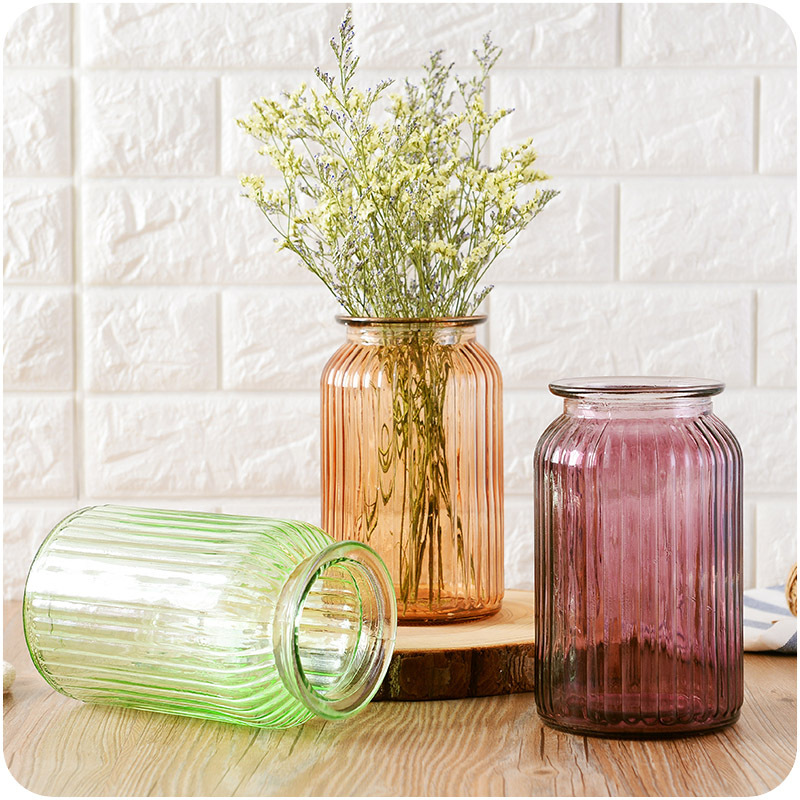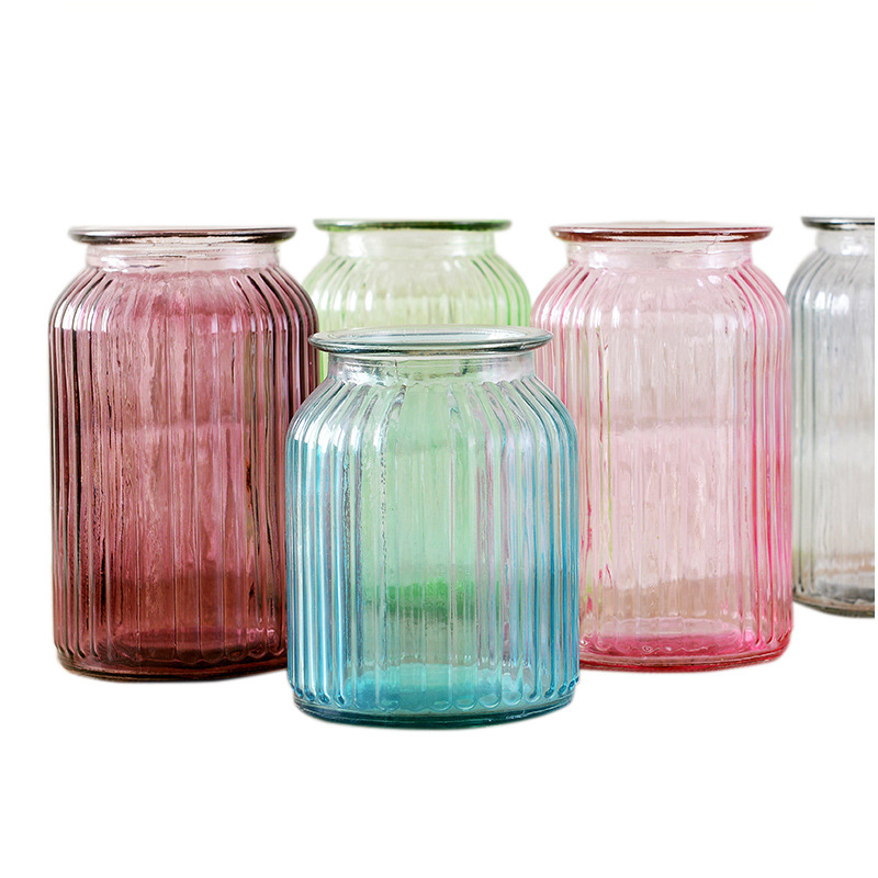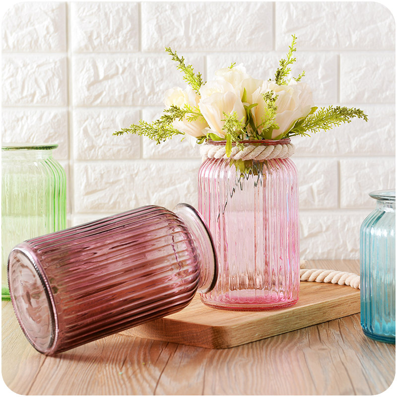 / 歐式彩色玻璃干花瓶家居簡約風擺件客廳創意透明鮮花瓶定制豎紋厚
