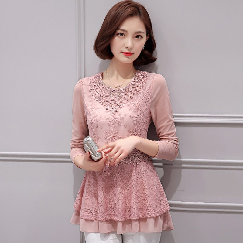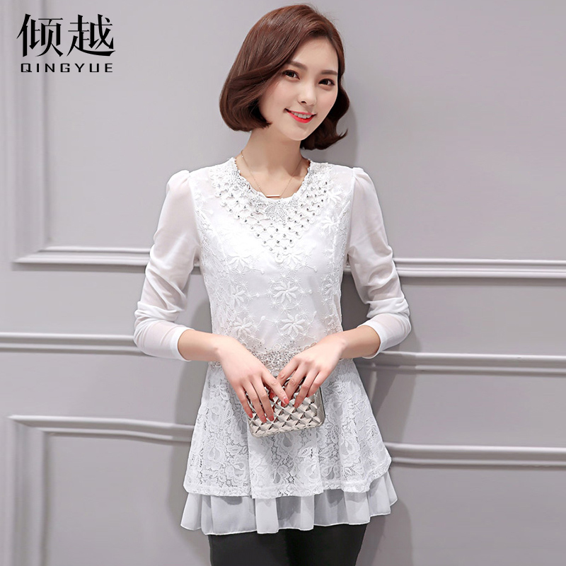 傾越2017春款女裝中長款蕾絲衫鑲鉆鏤空打底衫修身顯瘦雪紡上衣潮