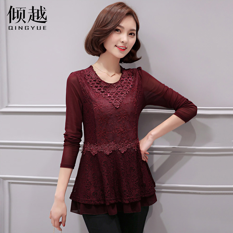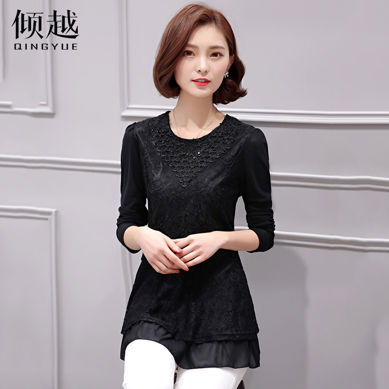 / 傾越2017春款女裝中長款蕾絲衫鑲鉆鏤空打底衫修身顯瘦雪紡上衣潮