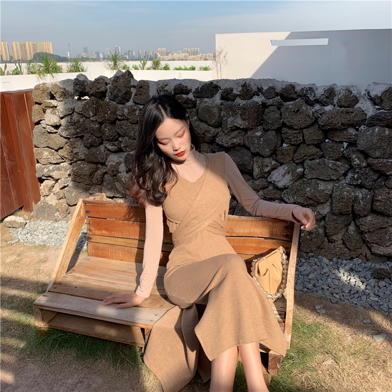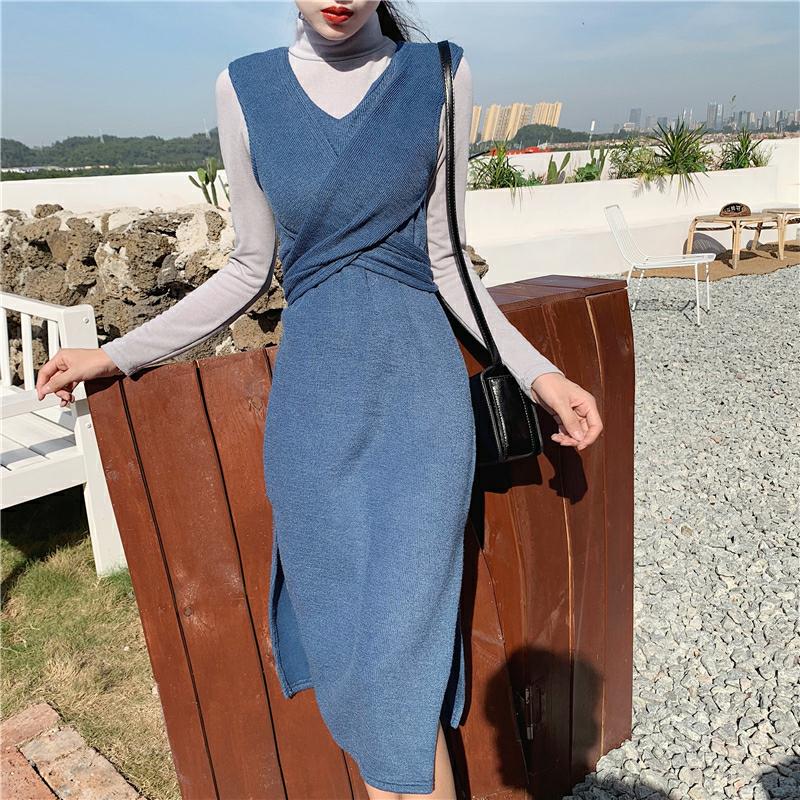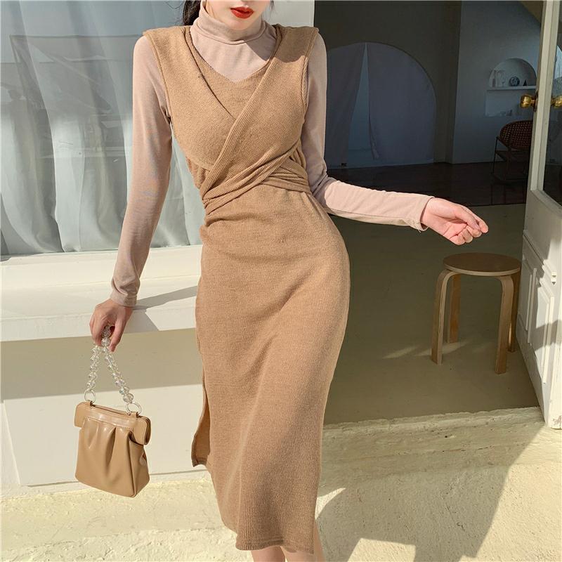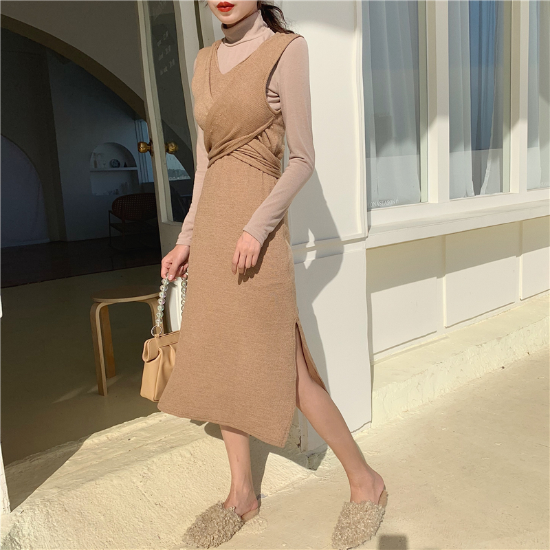 百搭高領打底衫+復古高腰氣質開叉針織背心連衣裙