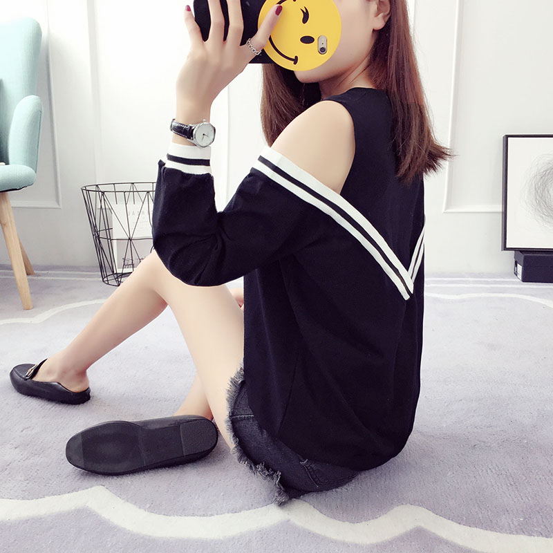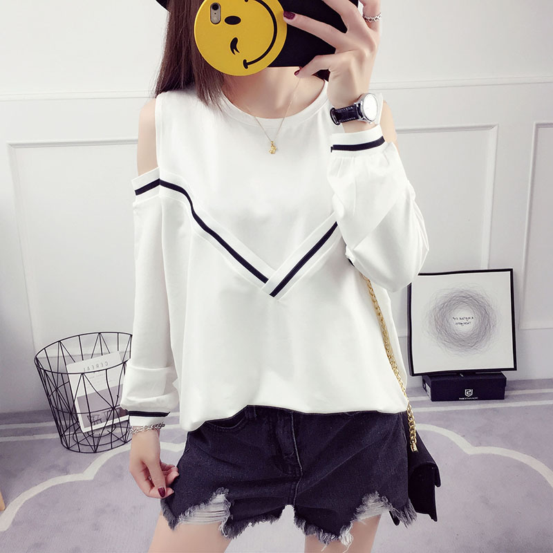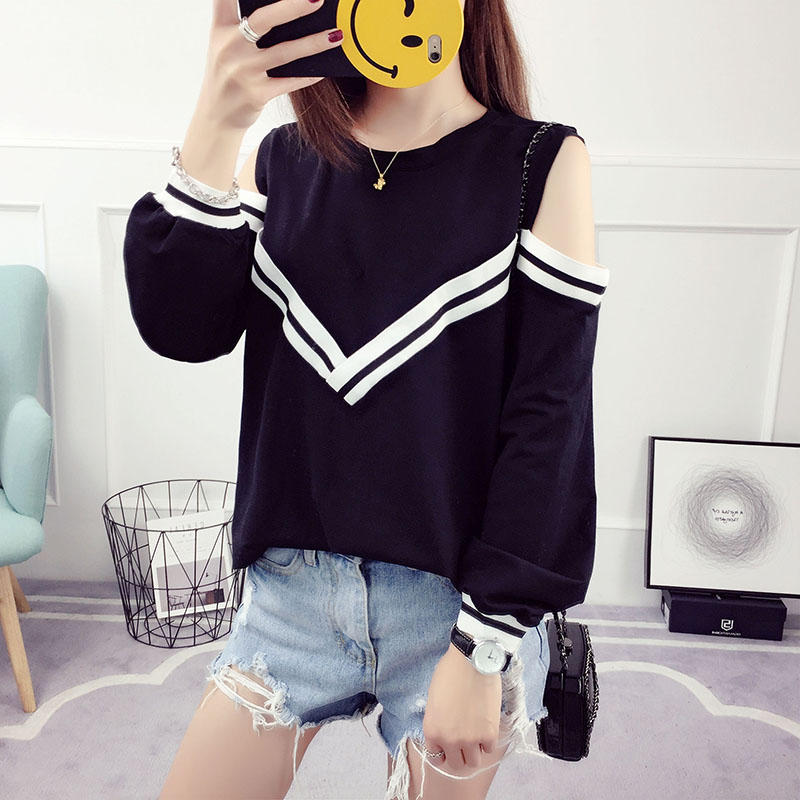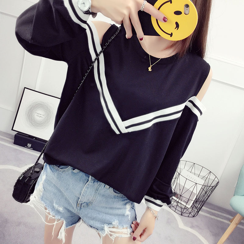 / 露肩上衣女夏裝新款韓版百搭學生寬松長袖t恤性感甜美學院風