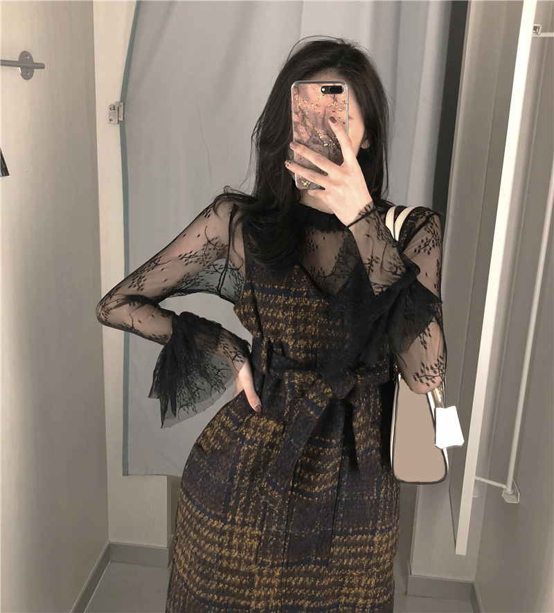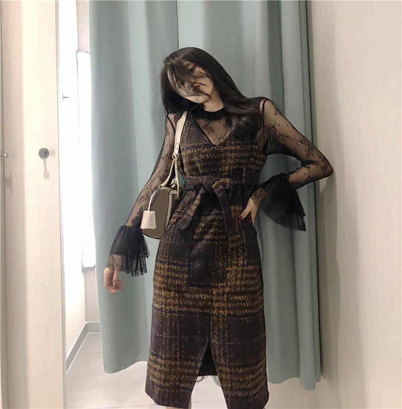 氣質復古格子毛呢長款連衣裙時尚套裝喇叭袖網紗打底上衣兩件套女