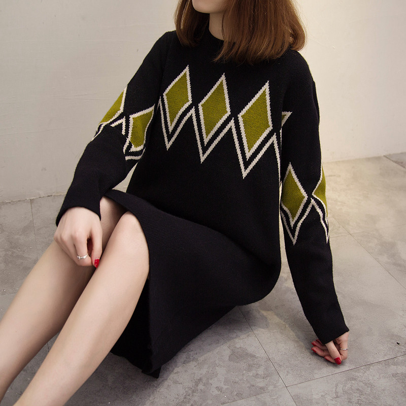/ 套頭圓領毛衣女秋冬拼色菱形格打底衫中長款寬松毛衣裙加厚外套女