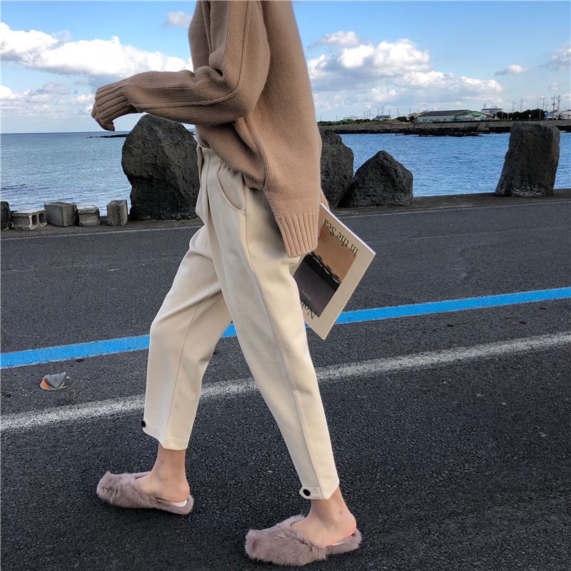 / 褲子女新款韓版百搭時尚松緊腰褲腳紐扣抽褶毛呢九分休閑直筒褲潮