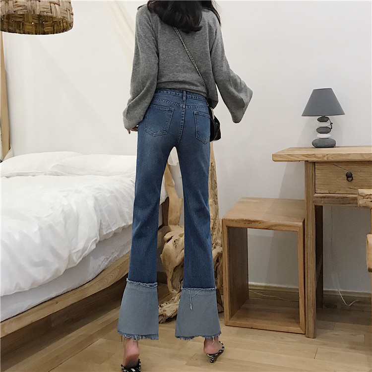 / 褲子女2018新款韓版拼接氣質chic撞色排扣高腰顯瘦微喇叭牛仔褲潮